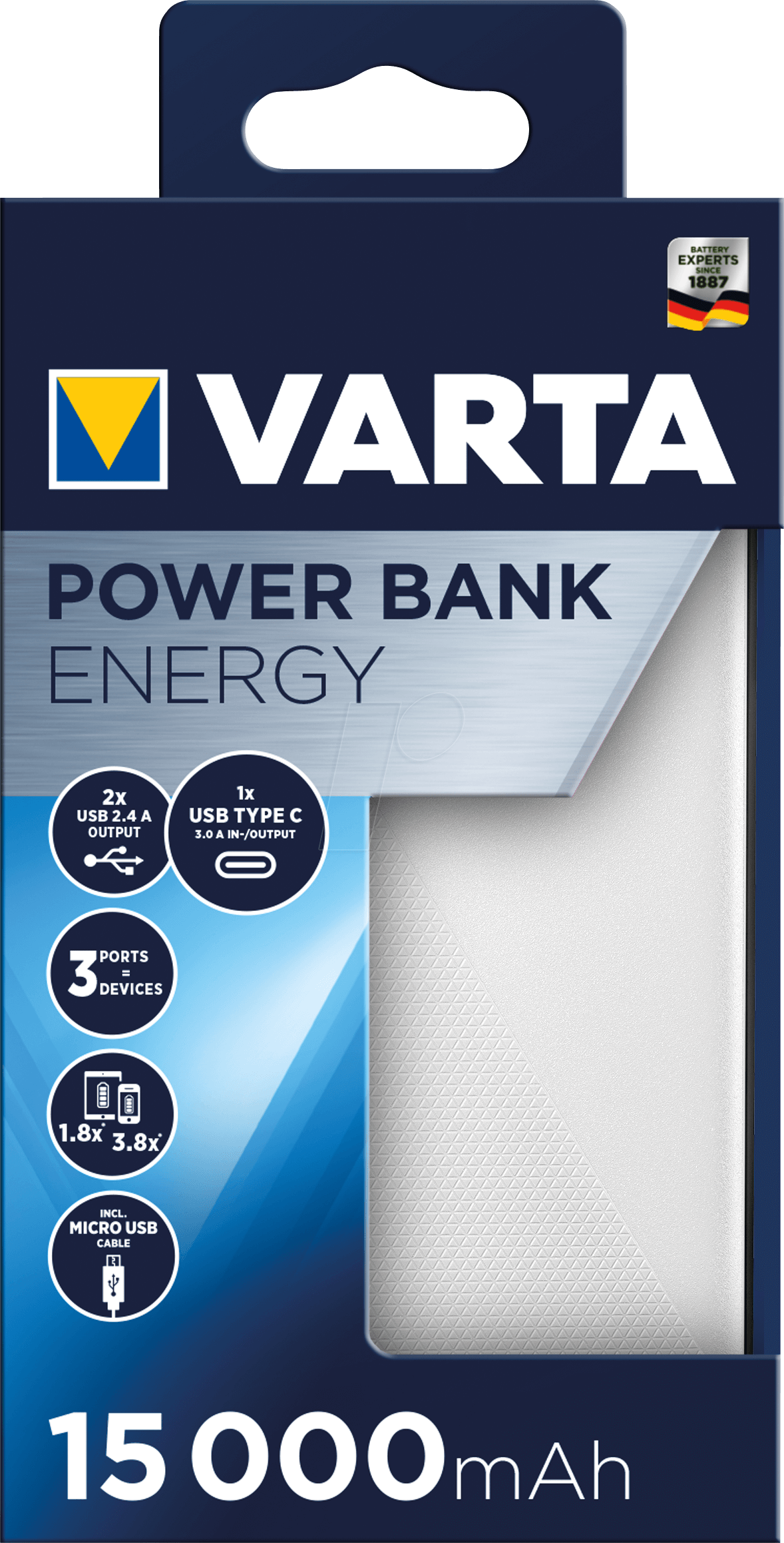 Power Bank-urile VARTA Energy sunt disponibile în 4 capacități diferite, de la 5.000 mAh până la 20.000 mAh, pentru a se potrivi oricărei cereri individuale de energie. Încărcați 3 dispozitive simultan cu porturile USB Type C și USB A incluse pentru a nu mai rămâne niciodată fără energie. Tehnologia avansată de siguranță și designul subțire VARTA fac din VARTA Energy Power Banks partenerul perfect, care oferă flexibilitate și independență în deplasari.