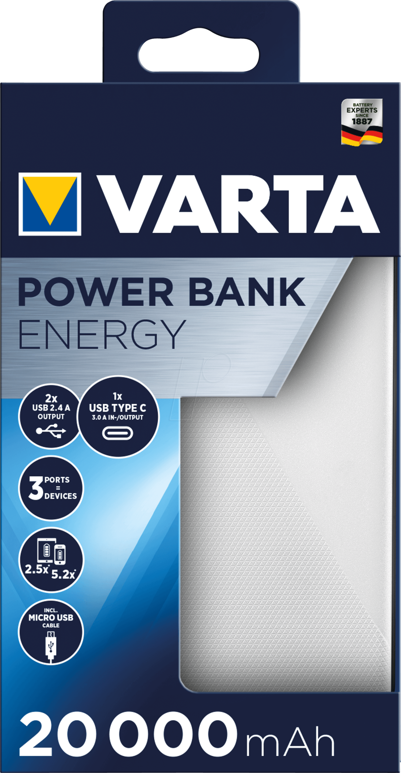 Power Bank-urile VARTA Energy sunt disponibile în 4 capacități diferite, de la 5.000 mAh până la 20.000 mAh, pentru a se potrivi oricărei cereri individuale de energie. Încărcați 3 dispozitive simultan cu porturile USB Type C și USB A incluse pentru a nu mai rămâne niciodată fără energie. Tehnologia avansată de siguranță și designul subțire VARTA fac din VARTA Energy Power Banks partenerul perfect, care oferă flexibilitate și independență în deplasari.