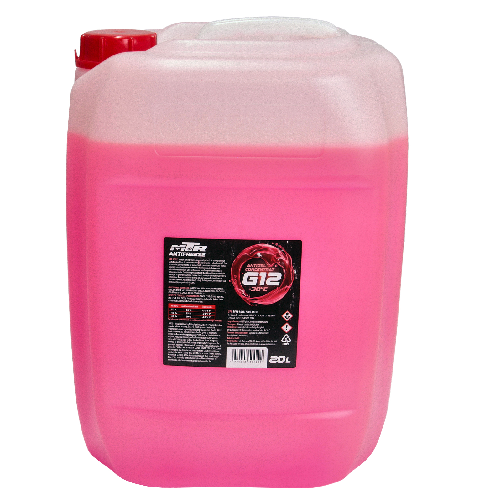 Antigelul concentrat MTR G12 este fabricat pe baza de glicoli, cu adaos de stabilizatori si inhibitori de coroziune organici de tip carboxilic. Este recomandat pentru orice tip de autovehicol cu motor modern, de ultima generatie, care functioneaza cu benzina sau motorina, inclusiv pentru autoturisme cu motoare ultraperformante – bloc motor din aluminiu, functionare la turatii si temperaturi ridicate. Ofera protectie anticoroziva pentru toate metalele si aliajele utilizate in constructia sistemelor de racire si a motoarelor din industria auto. Asigura protectie impotriva inghetului in functie de concentratie, conform tabelului de mai jos: