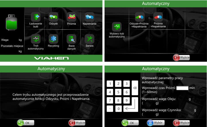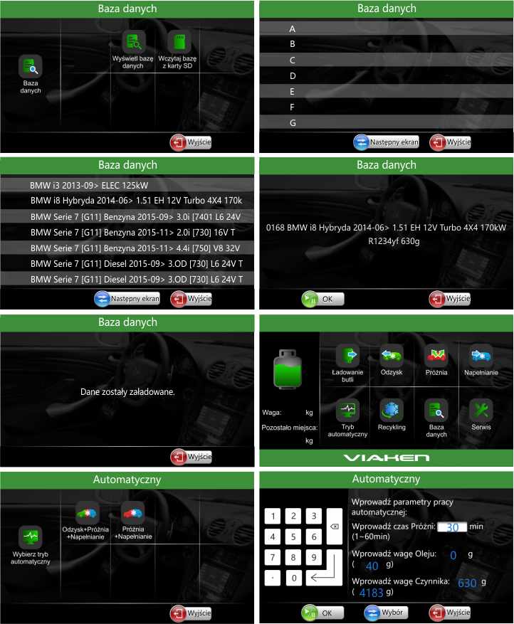 afișate pe ecran complet în poloneză MOD AUTOMAT Ciclul complet automat facilitează funcționarea și elimină riscul de erori la întreținerea sistemelor A/C MOD MANUAL Posibilitatea de selectare manuală a funcții individuale din meniul principal. instructiuni precise afisate pe ecran in limba poloneza conduc operatorul „de mana” .BAZA DE DATE MARCA POPULAR Contine informatii tehnice despre cantitatea de agent frigorific. Stația este echipată cu un cititor de card SD pentru actualizarea bazei de date . Doar originalul Viaken are limba poloneză și baza de date curentă SPECIFICAȚII