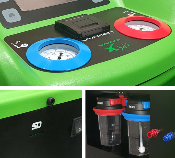 Stația este echipată cu manometre analogice mari și lizibile de înaltă și joasă presiune, o imprimantă termică vă va permite să tipăriți un raport al activităților efectuate, iar rezervoarele ermetice de ulei minimizează riscul de a pătrunde în sistemul de umiditate. Stația este echipată cu un cititor de carduri SD pentru a opera baza de date a utilizatorilor, iar ecranul tactil accelerează serviciul. Setul include, de asemenea, furtunuri profesionale și conexiuni de service HP și LP pentru noul agent frigorific R1234YF
