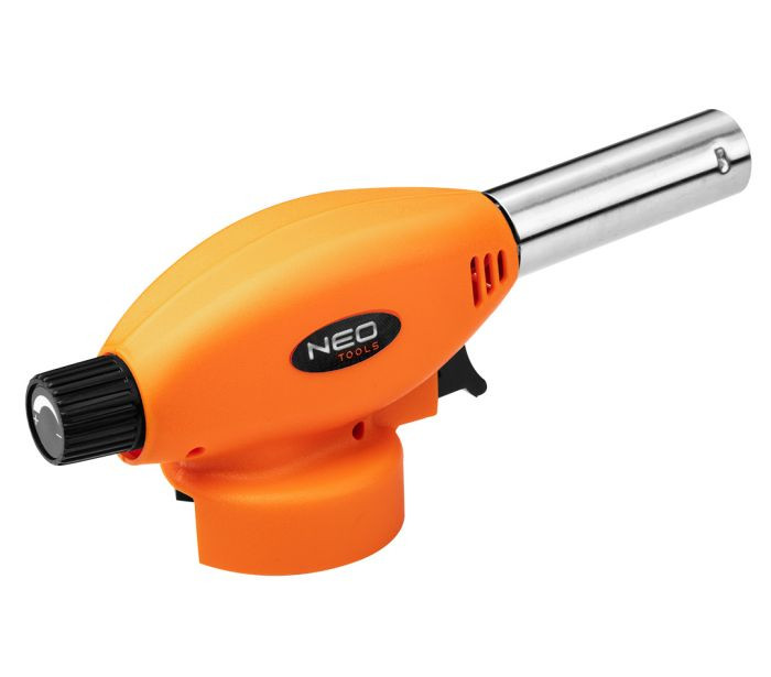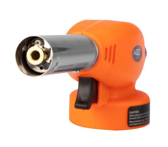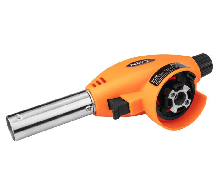 Lampă de lipit cu gaz pentru cartușe de 227 g (tip EN 417), aprindere piezoelectrică, pentru funcționare verticală (+/- 80 grade), temperatură de funcționare 1300 °C, putere 1,3 kW, consum mediu de gaz 80 g/h, carcasă din plastic, buton de aprindere momentană.