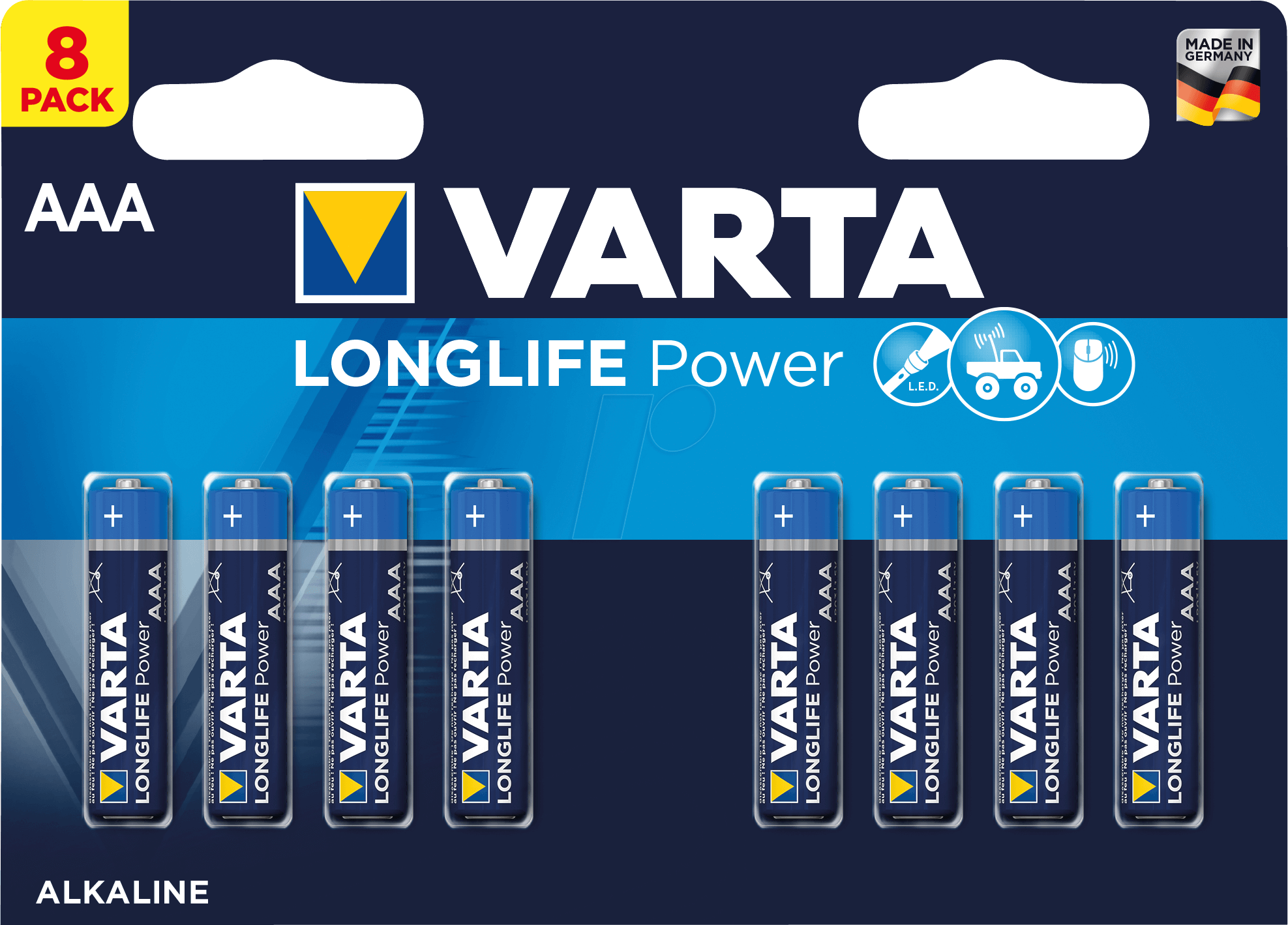 Dacă aveți nevoie de cât de multă putere puteți obține – acesta este cel potrivit! VARTA Longlife Power este cea mai puternică dintre bateriile alcaline VARTA. Dezvoltat special pentru dispozitive cu consum mare de energie. Rămâneți independent cu puterea bateriei de înaltă performanță atunci când utilizați dispozitive care consumă energie, cum ar fi jucăriile controlate de la distanță, echipamente de calculator sau lanterne LED.