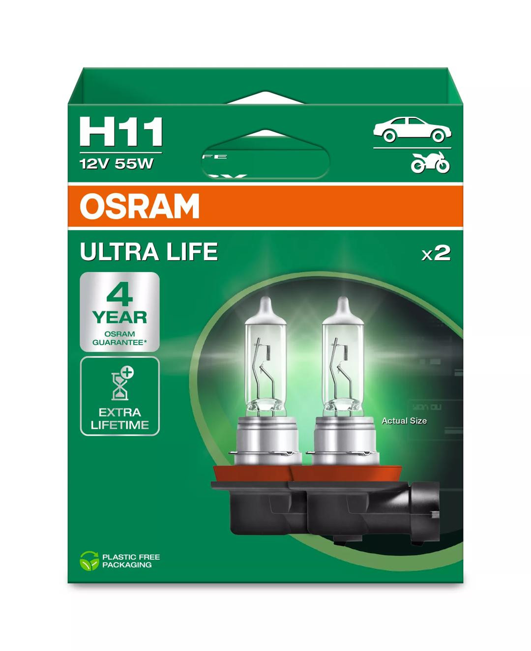 Lămpile auto OSRAM ULTRA LIFE sunt preferate când vine vorba de durabilitate. Au o durată de viață impresionantă de până la patru ori mai mare în comparație cu lămpile cu halogen standard și durează până la 100.000 km (cu un kilometraj mediu anual de 14.259 km și 60% lumină aprinsă). OSRAM oferă o garanție de 4 ani pentru farurile de încredere ULTRA LIFE (www.osram.com/am-guarantee). În plus, farurile ULTRA LIFE au un design modern cu capac argintiu (H4/H7/H11). Prin urmare, sunt ideale pentru șoferii frecventi sau pentru persoanele care folosesc luminile de zi și pot fi folosite și în farurile din sticlă transparentă.
