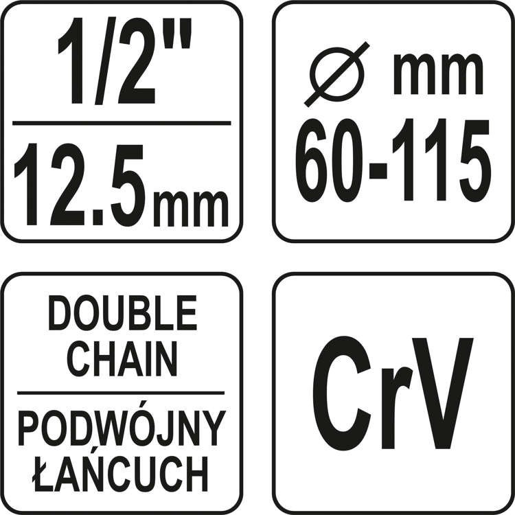 Cheie cu lanț dublu, proiectată pentru filtre de ulei cu diametre de la 60 la 170 mm.