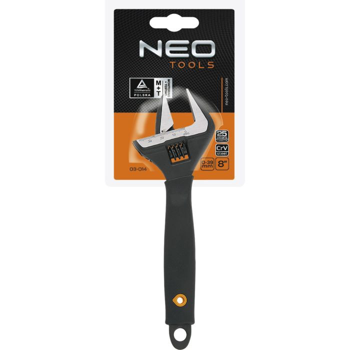 Cheie reglabila 8″, 200 mm Neo Tools 03-014. Deschidere: 0-38 mm, Lungime: 200 mm, Otel CrV forjat, cap solid, subtire, scara metrica cu interval de 40% mai mare decat o cheie standard, inclinarea capului de 22° la capatul flexibil, maner ergonomic acoperit cu material anti-alunecare, rezistent la lubrifianti si uleiuri