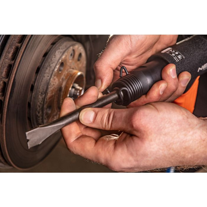 Ciocanul pneumatic cu percuție NEO se deosebește prin designul compact, permițându-vă să lucrați în locurile greu accesibile. Are conector de aer 1/4″.Instrument pentru uz universal în atelier, în muncile de tinichigerie, în construcții la forjare sau cioplire. Inclus: dălți 5 buc: plat 20mm, plat cu canelură 20mm, curbat 22mm, tăiat triunghiular 20mm, vârf 2mm, conexiune 1/4″ GZ 1 buc, ungător (gol) 1 buc, arc de fixare a ciocanului 1 buc. Certificatul CE confirmă calitatea înaltă a produsului. Marca NEO îndeplinește așteptările profesioniștilor.