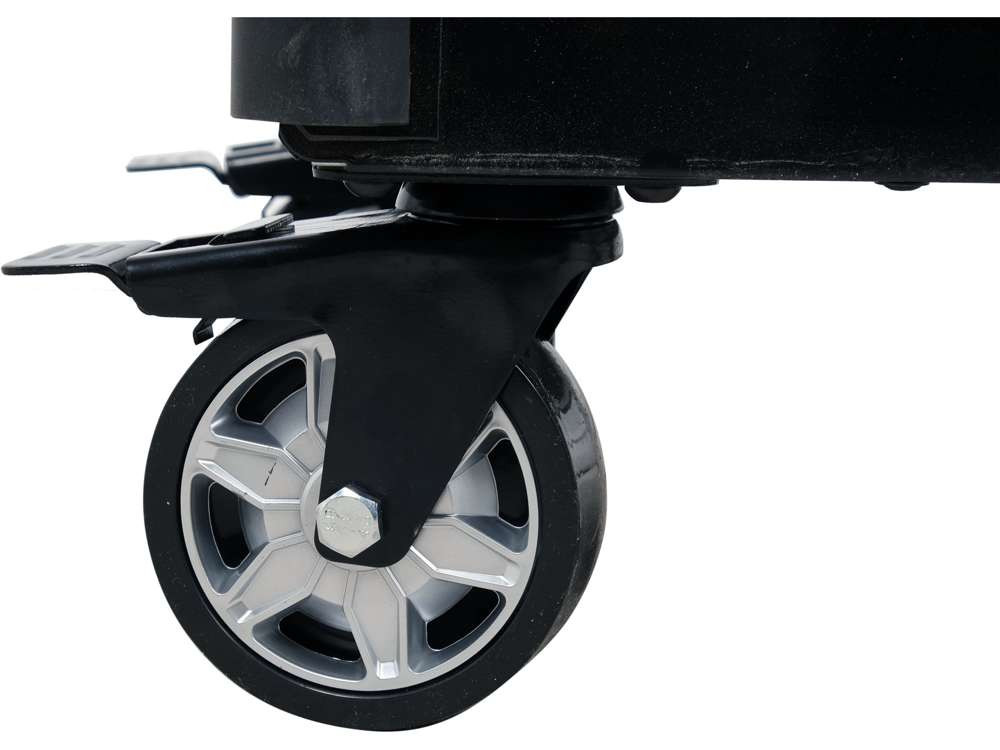 Structura stabilă se sprijină pe patru roți, dintre care două sunt pivotante și echipate cu frâne.