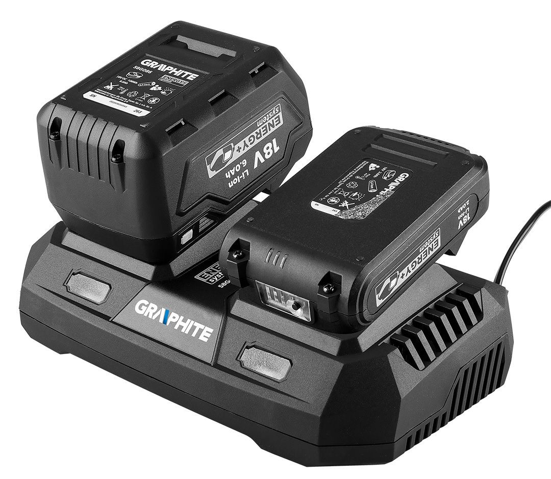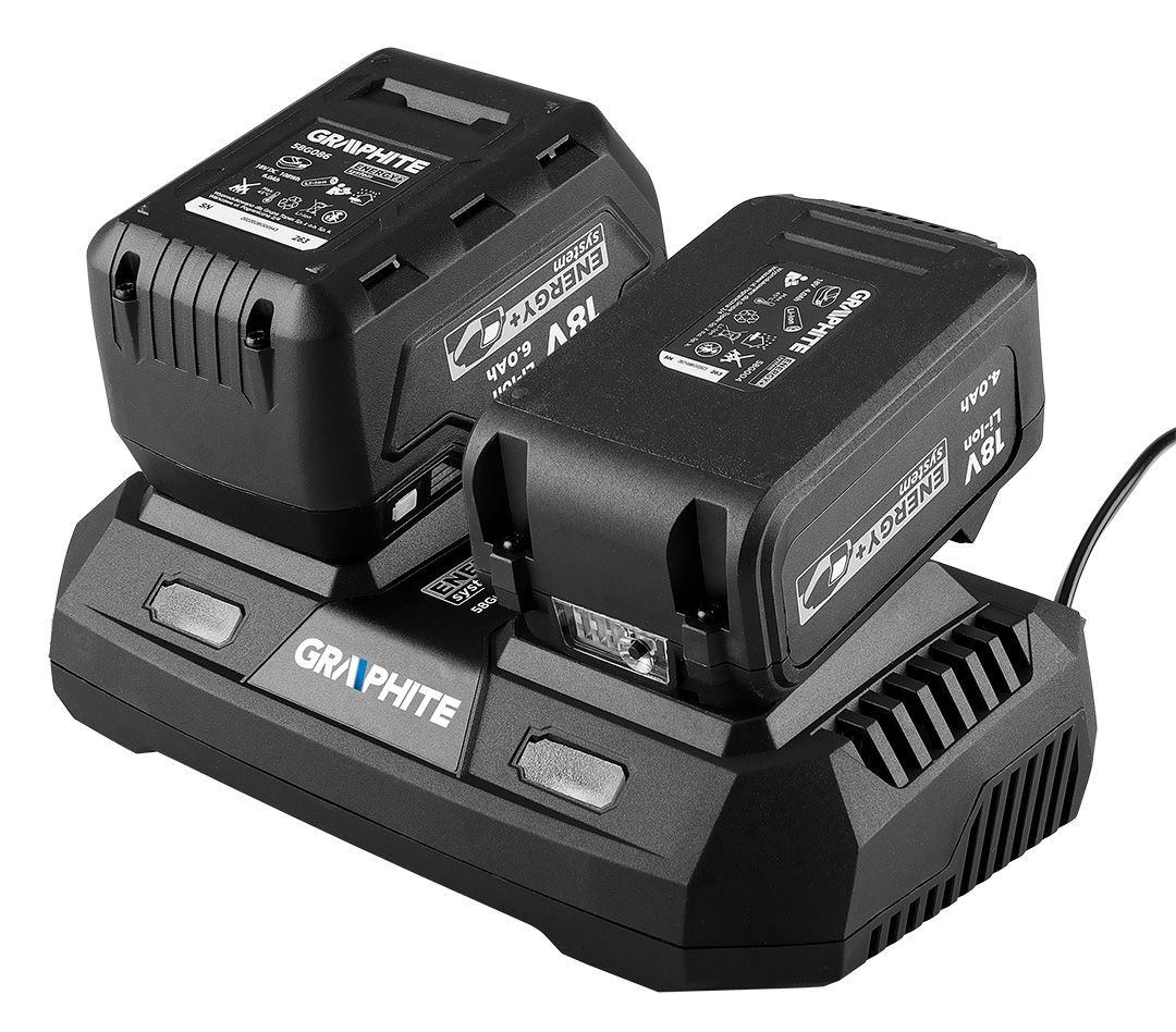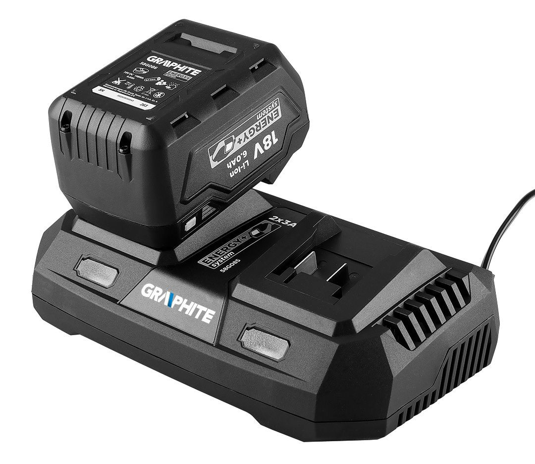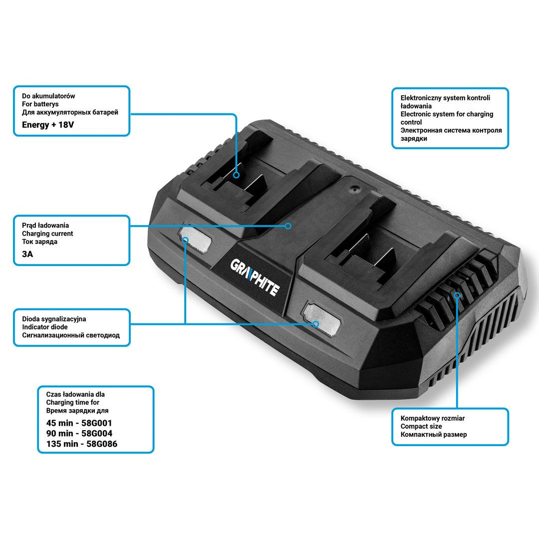 Încărcător de baterii pentru bateriile din gama GRAPHITE Energy+ 18V Li-Ion. Curent maxim de încărcare 2 x 3A. Timpul de încărcare a bateriei 58G001 este de 45 min, Timpul de încărcare a bateriei 58G001 este de 45 de minute, timpul de încărcare a bateriei 58G004 este de 90 de minute și Bateria 58G086 este de 135 min. Clear LEDs pentru informații despre tensiune conectată, încărcare în curs sau sfârșit de încărcare încărcare. Echipat cu sistem de control al tensiunii și temperaturii pentru pentru o protecție completă a bateriei și a utilizatorului. Dispozitivul este echipat cu un cablu de alimentare flexibil și robust, acoperit cu cauciuc Lung de 2 m, dedicat, de asemenea, aplicațiilor profesionale și industriale aplicații profesionale și industriale, atât în interior, cât și în exterior.