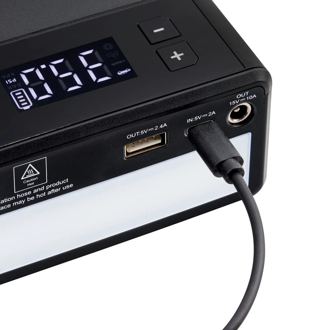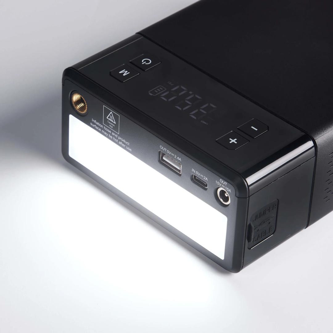 Trebuie să vă țineți anvelopele sub control? Dispozitivul de umflare a anvelopelor încorporat are un manometru digital și funcție de oprire automată pentru o umflare ușoară și precisă. Priza de 12 V vă permite să alimentați o gamă largă de dispozitive prin intermediul brichetei, în timp ce banca de alimentare USB vă asigură că vă puteți încărca telefonul sau alte gadgeturi oriunde v-ați afla.