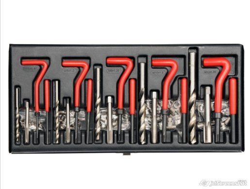 Kit de reparare profesionale filet M5-M12. Mașini de găurit și robinete sunt fabricate din HSS Derivații 4,341th cu un singur tăiat firul, în care inserția a introdus spirala din otel dur. Pentru a introduce inserții buton este lider și atacant, care obłamuje proeminent capăt al inserției. Kit-ul este proiectat pentru 5 tipuri diferite de fire: M5 x 0,8 x 6,7 mm, M6 x 1,0 x 10,8 mm, M8 x 1,25 x 10,8 mm, M10 x 1,5 x 13,5 mm, M12 x 1,75 x 16,3 mm.