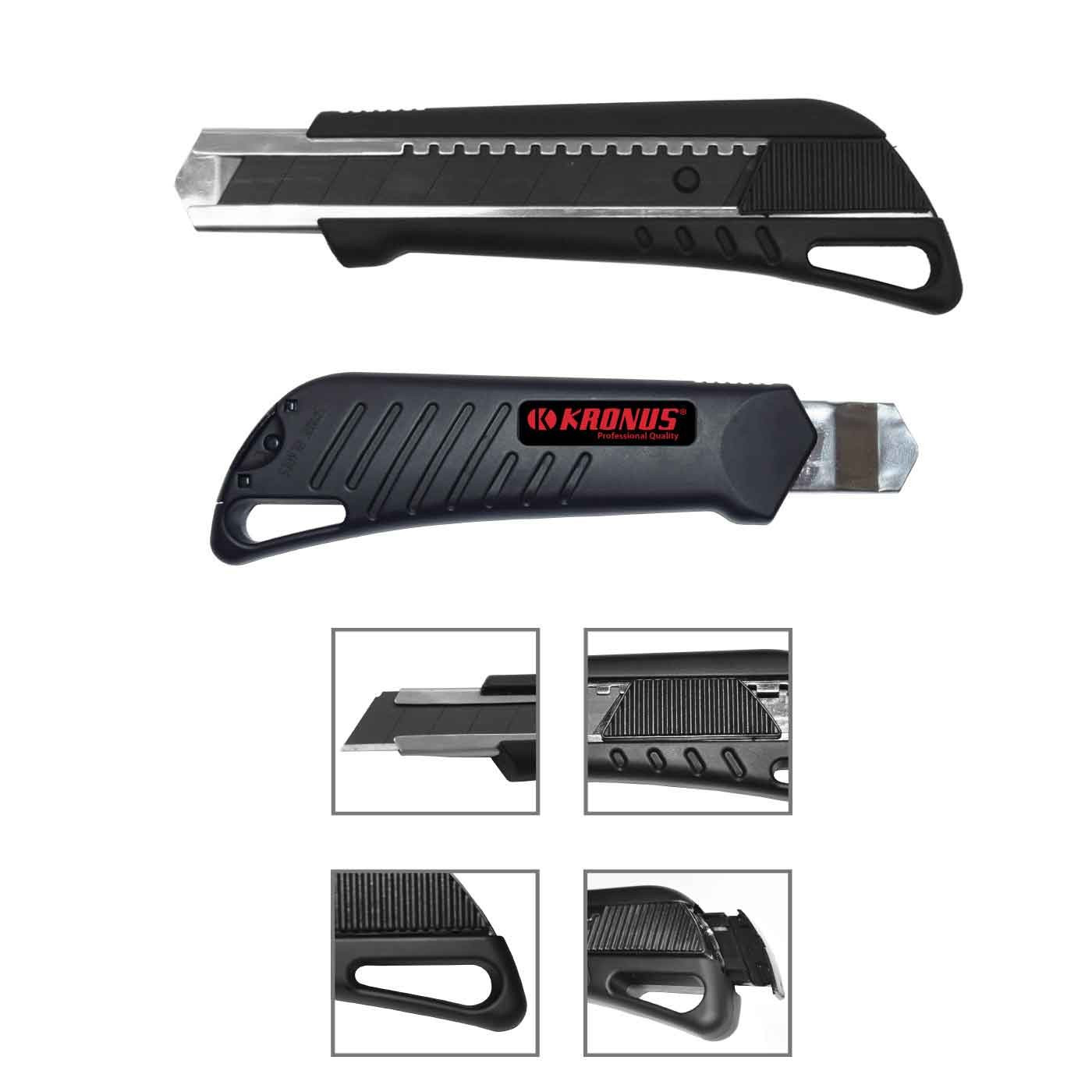 Kronus 900632 este un cutter universal cu maner din ABS cauciucat, anti-alunecare, si lama din otel aliat SK2, cu 13 segmente, cu latimea de 18 mm si lungimea de 160 mm.