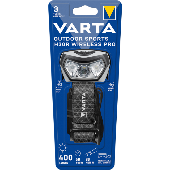 Lanterna LED frontala reincarcabila Varta Outdoor Sports H30R Wireless Pro, 400 lm, IPX7, acumulator 1800 mAh