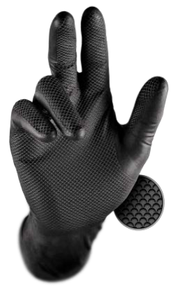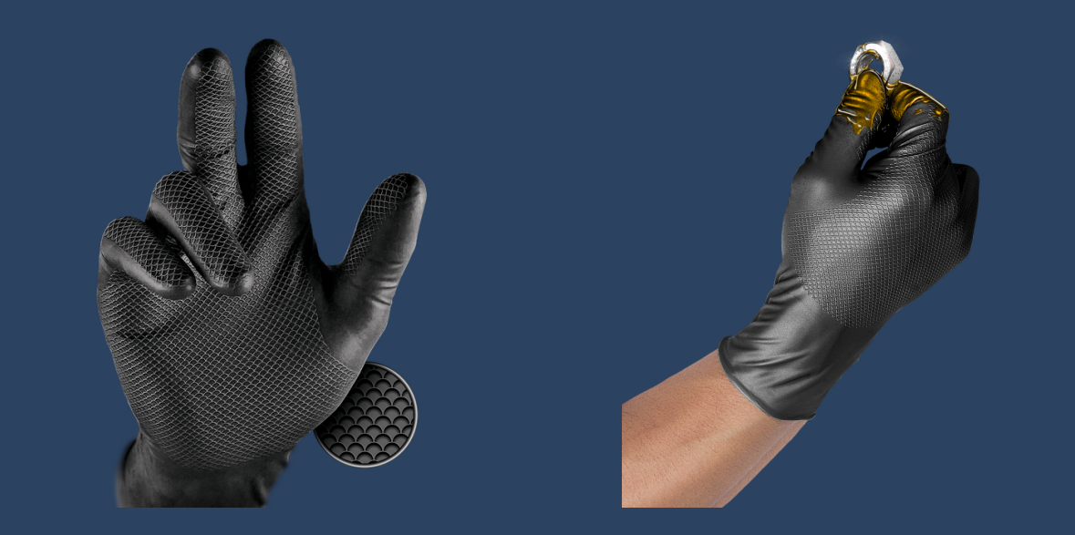 Mănușile Grippaz sunt fabricate cu o formulă specială de NBR (cauciuc nitrilic). Aspectul inovator al acestora cu textura tip solzi de pește pe ambele suprafețe, asigură o potrivire perfectă fie pe mâna stângă, fie pe cea dreaptă. Datorită compoziției speciale, mănușile au o rezistență superioară la majoritatea agenților de curățare. Compusul din nitril al mănușilor în contact cu pielea și căldura umană se relaxează și se mulează perfect pe forma mâinii, asigurând o fixare sigură și confortabilă.
