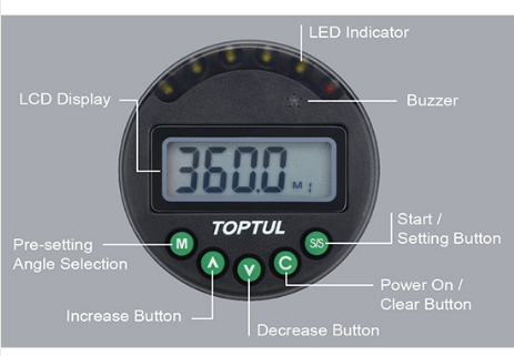 Unghi Precizie: ± (rotire la 90 ° la viteza de 30 ° / sec) 2 ° Măsurarea Unitate: Grad Rezoluție: 0,1 ° Intervalul țintă ° 1 – la 360 ° (increment 1 °) Unghiul de rotație de până la 999 ° 9 valori țintă prestabilite Memorie de stocare: 50 citiri în sensul acelor de ceasornic și în sens contrar acelor de ceasornic Lumini cu 6 direcții și buzzer la atingerea valorii unghiului Indicator de baterie scăzut și oprire automată (după 2 minute)