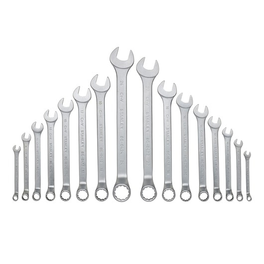 Modulul de chei combinate STANLEY® TRANSMODULE SYSTEM™ conține 16 chei cu inel cu decalaj. Fiecare cheie are fălci anti-alunecare, profil Maxi-Drive și finisaj cromat mat. Setul conține următoarele dimensiuni: 6 mm, 7 mm, 8 mm, 9 mm, 10 mm, 11 mm, 12 mm, 13 mm, 14 mm, 15 mm, 16 mm, 17 mm, 18 mm, 19 mm, 22 mm, 24 mm. Proiectate pentru a se potrivi cu gama de dulapuri cu role Stanley și pentru a fi utilizate cu gama de dulapuri de depozitare compatibile cu sistemul Transmodule.