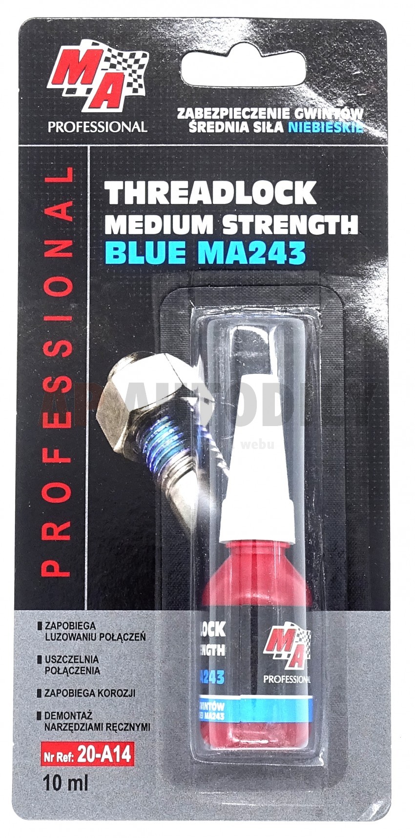 Caracteristici:rezista la temperaturi cuprinse intre – 54 grade C si pana la +149 grade C;permite dezasamblarea mecanica cu unelte de mana;se intareste dupa aproximativ 20 minute, iar dupa 24 ore se solidifica;recomandat pentru suruburi de marimea M6 pana la M20, folosite in componente care necesita demontare periodica;continut: 10 ml.