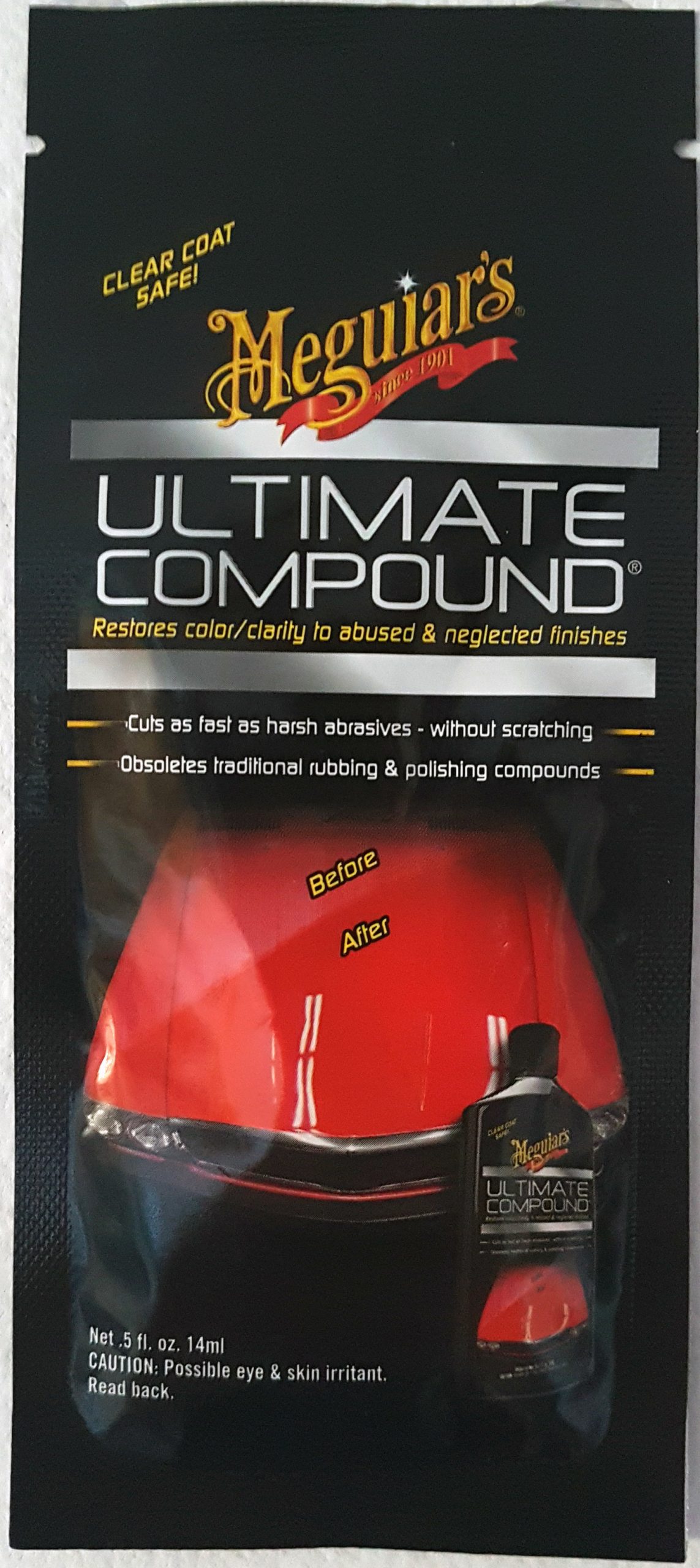 Meguiar’s Ultimate Compound inlatura defectele din stratul de lac/vopsea. Este cel mai bun produs pentru inlaturarea oxidarii, zgarieturilor, petelor de apa, precum si alte tipuri de pete, fara a zgaria.