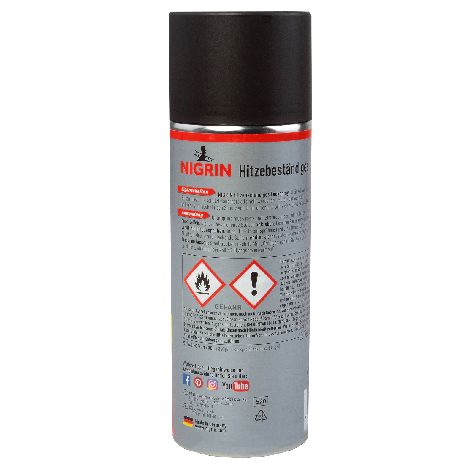 Spray vopsea rezistenta la caldura 400ml Nigrin ofera protectie rezistenta tuturor componentelor mai fierbinti ale motorului si celor de evacuare ,are proprietati adezive excelente ,protejeaza impotriva coroziunii si a aschiilor de piatra ,este, de asemenea, potrivit pentru spatii de renovare, burlanele sobelor, protectia tevilor si a gratarelor.