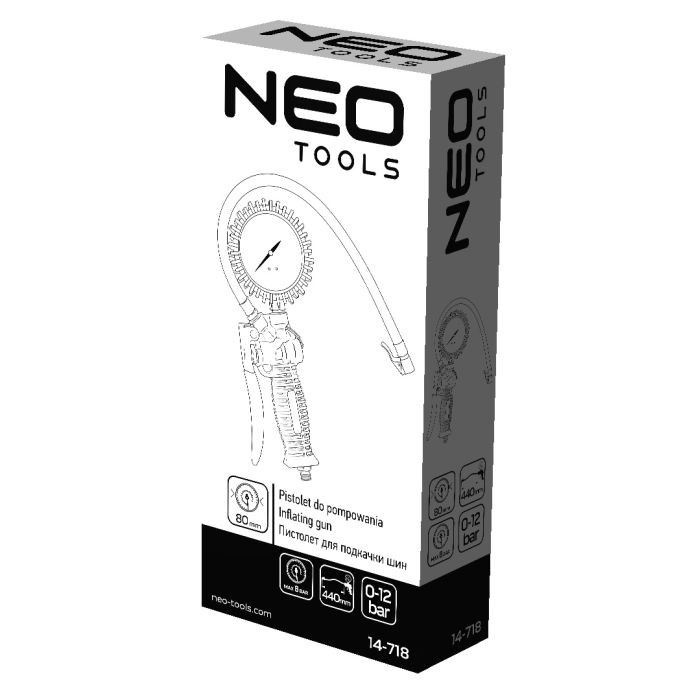 Pistol de umflare Neo cu manometru, fabricat din aluminiu. Presiunea maximă de lucru 12 bar. Are un cârlig practic pentru agățare și un furtun cu o lungime de 900 mm. Cu o scală mare, ușor de citit, pentru o măsurare precisă a presiunii. Certificatul CE confirmă calitatea înaltă a sculei. Marca Neo răspunde așteptărilor profesioniștilor.