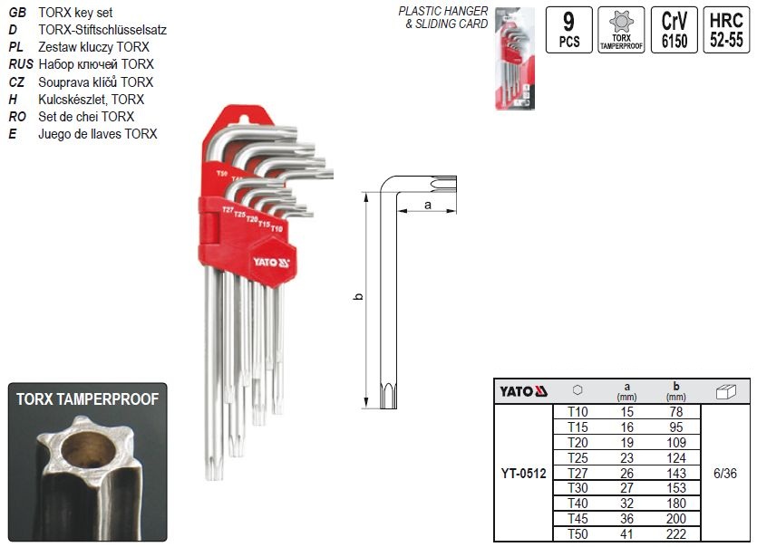 Dimensiuni torx: T10; T15; T20; T25; T27; T30; T40; T45; T50 mm