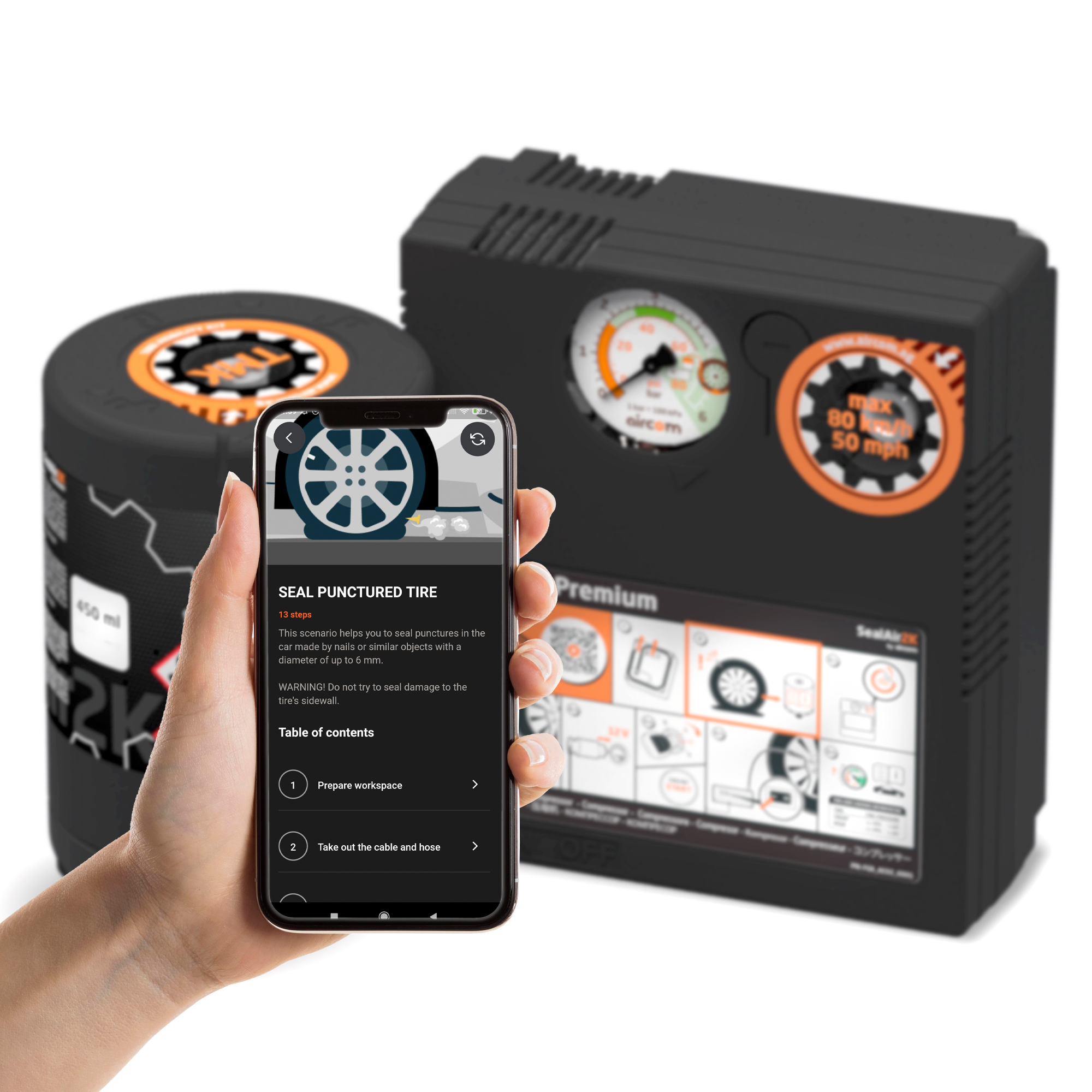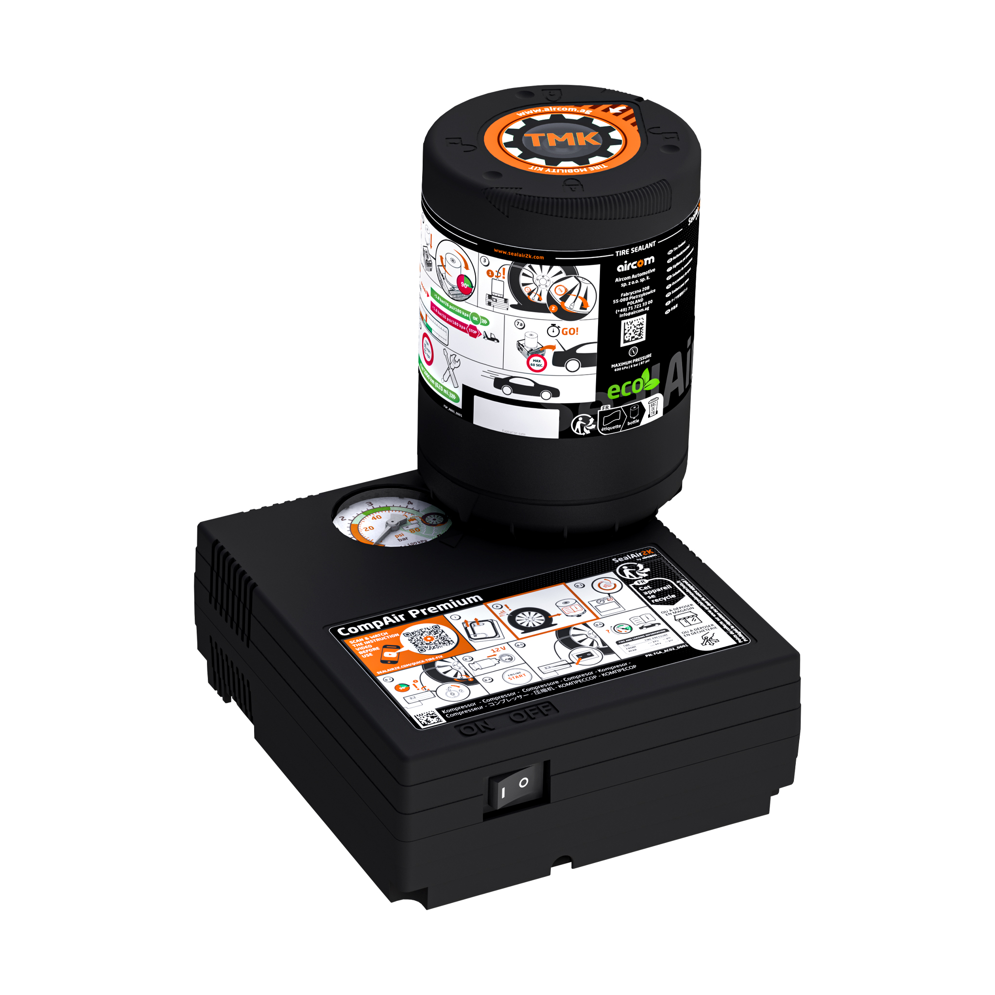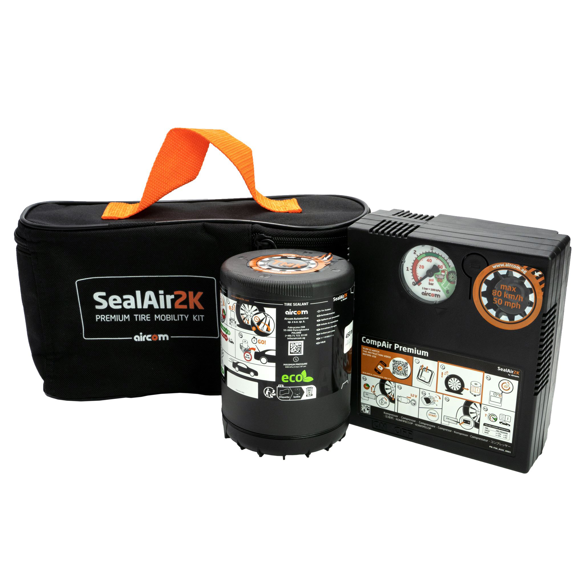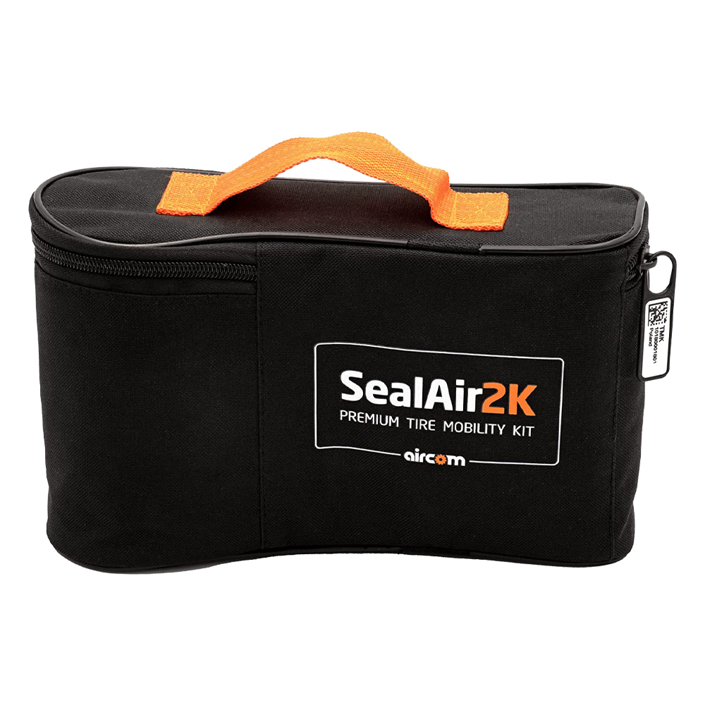 Setul SealAir2k by Aircom include un compresor de aer pentru umflarea rotilor cu o putere de 180W, o solutie de etansare 100% ecologica, cu o capacitate de 350ml, un furtun de aer suplimentar si instructiuni de utilizare.
