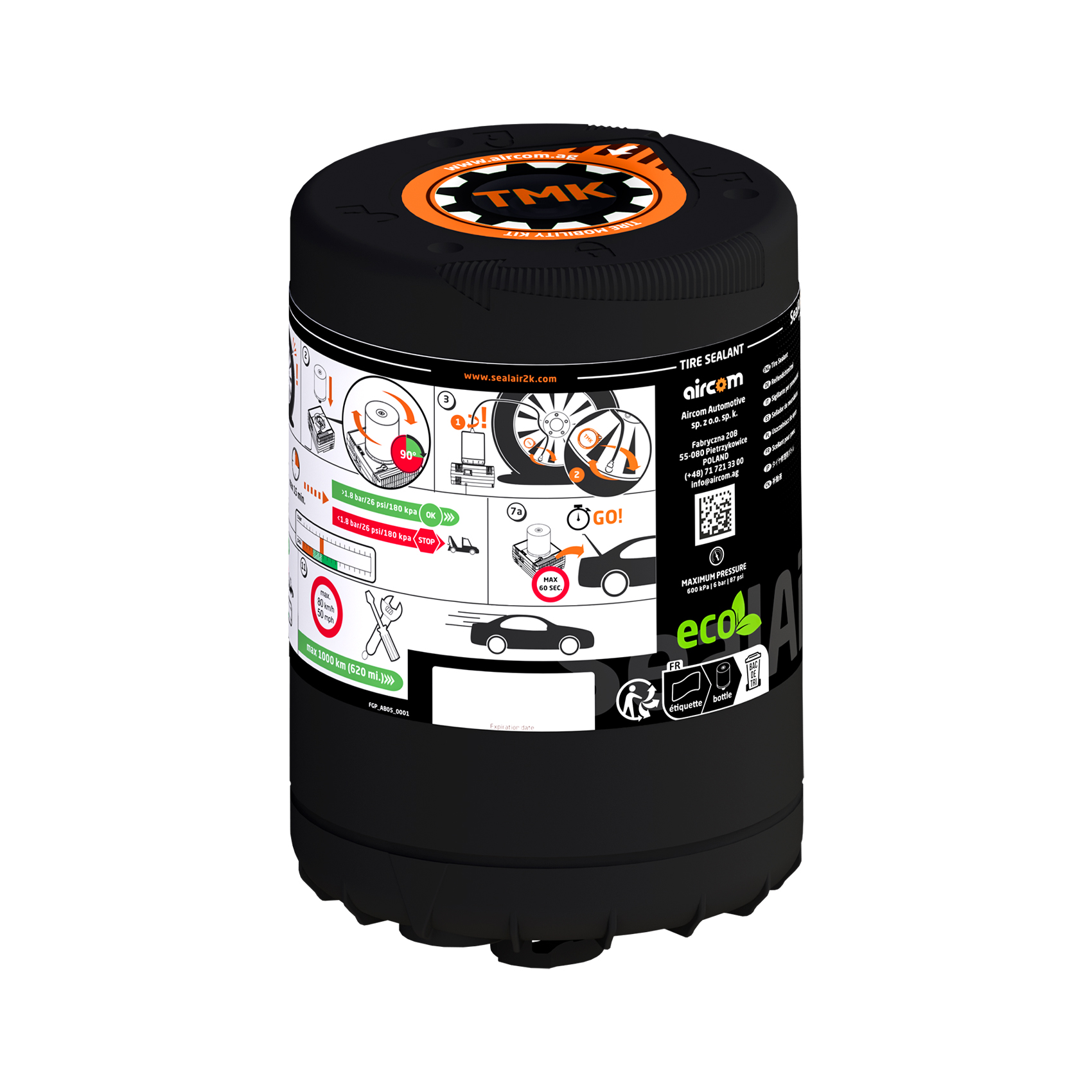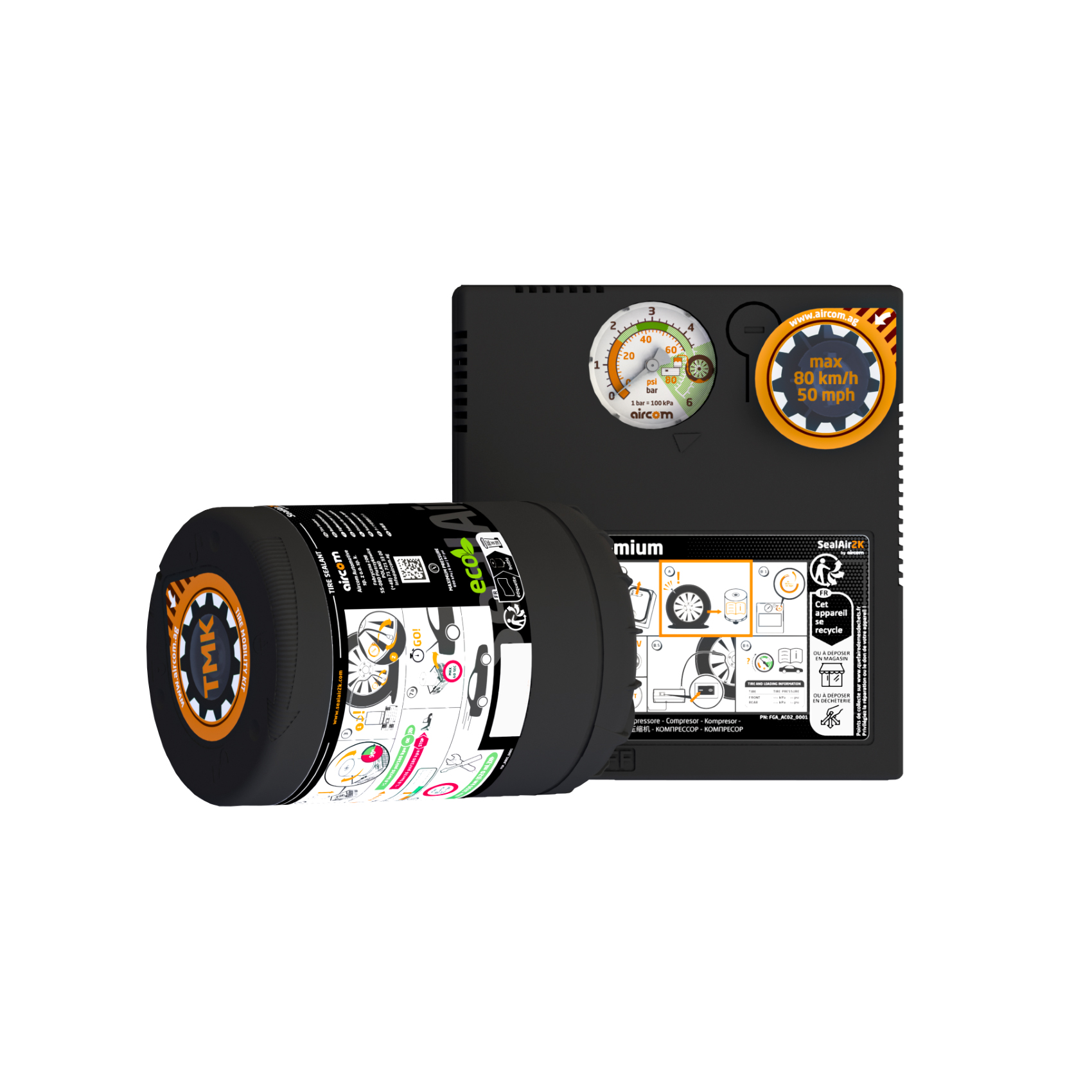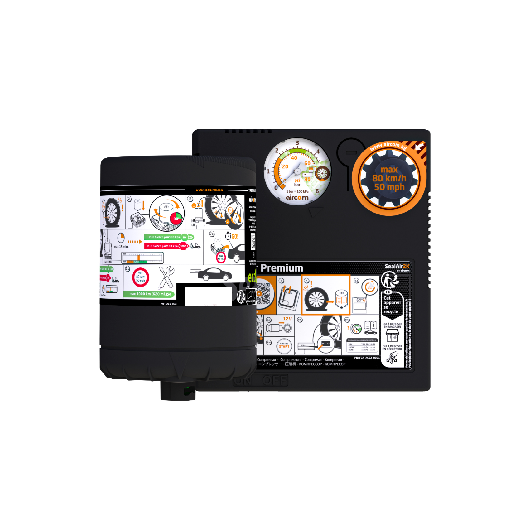 Setul SealAir2k by Aircom include un compresor de aer pentru umflarea rotilor cu o putere de 180W, o solutie de etansare 100% ecologica, cu o capacitate de 350ml, un furtun de aer suplimentar si instructiuni de utilizare.