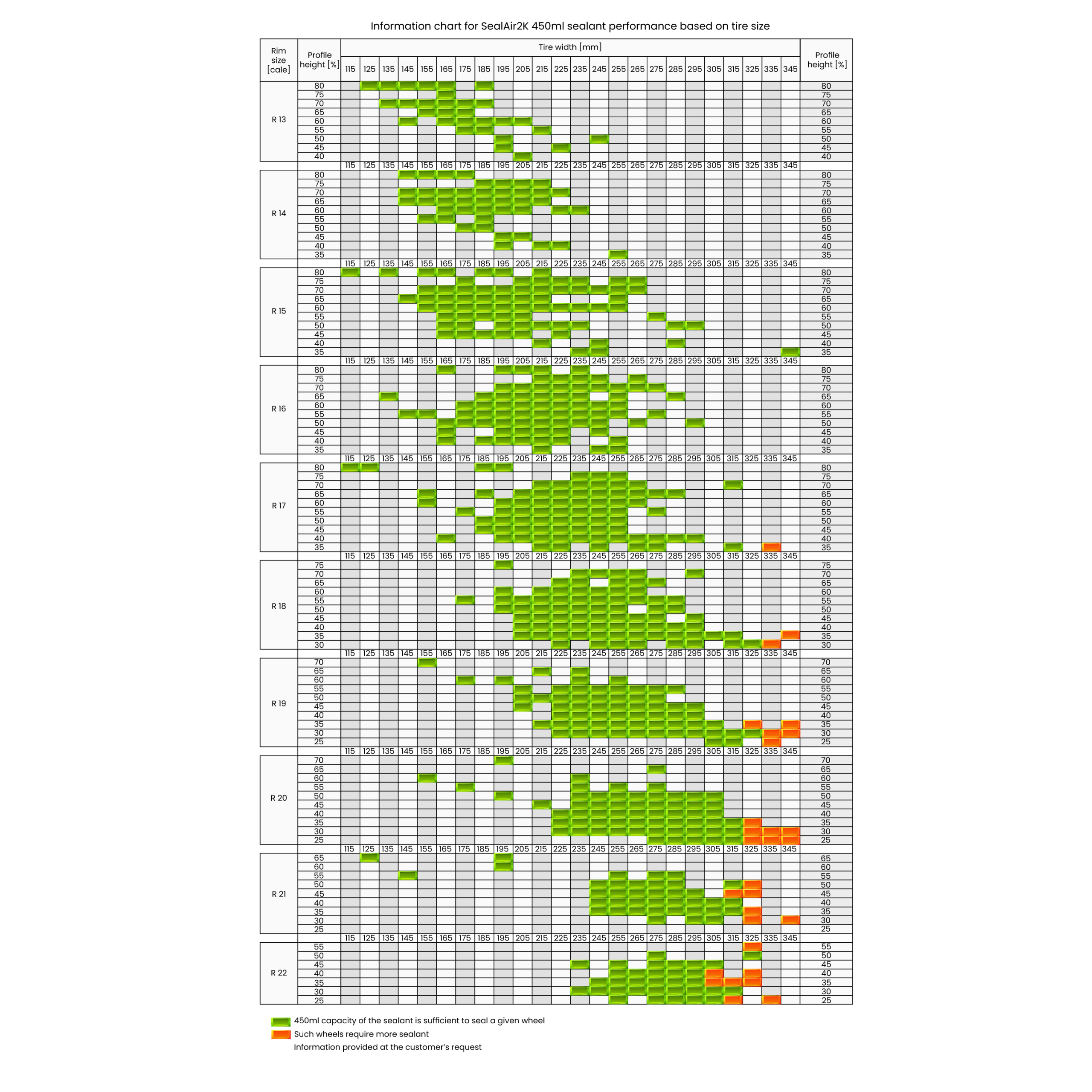 solutia de etansare este potrivita atat pentru masinile normale cat si pentru SUV-uri sau utilitare, cantitatea fiind suficienta pentru anvelope cu dimensiuni variate, de la R13 la R22 (pentru informatii exacte vezi tabelul informativ din galeria foto);