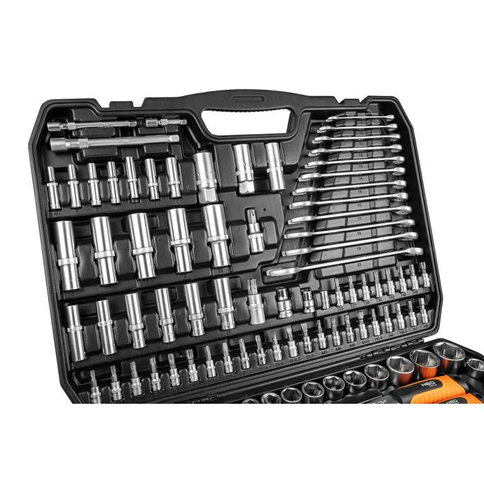 „Setul complet de chei și accesorii de la marca NEO, care conține 300 de piese cu diametre de fixare de ½””, 3/8″” și 1/4″”. Este o propunere de unelte care beneficiază de o garanție de 25 de ani pentru utilizatorii cei mai exigenți, confirmând cea mai înaltă calitate a produselor oferite. Include echipamentul necesar pentru fiecare meșter, cum ar fi chei fixe, chei hexagonale, capete de prindere, roți de răsucire, mânere, prelungitoare, suporturi și multe altele.