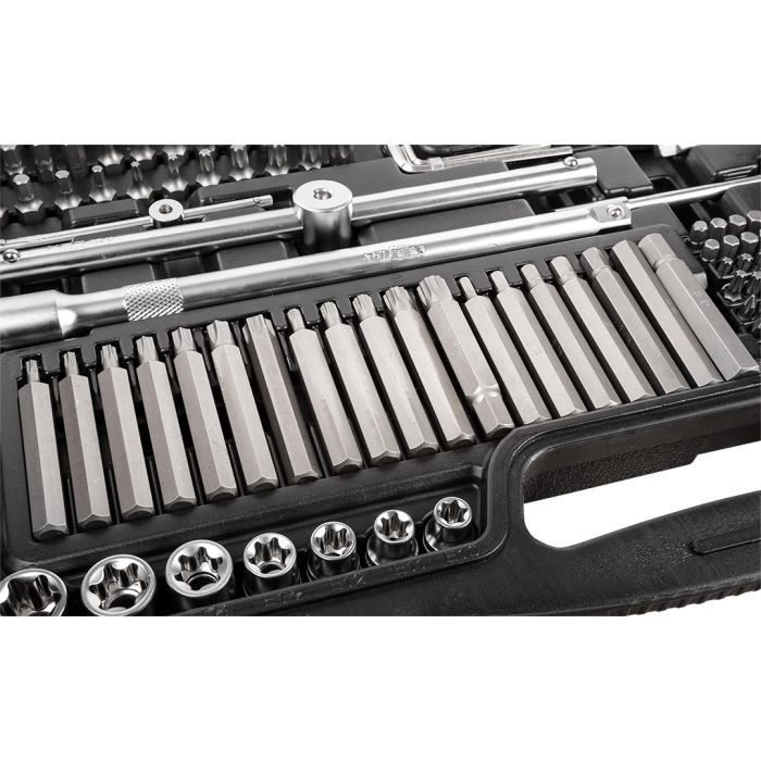 Setul conține: chei plate cu clichet 12 buc.: 8, 10, 11, 12, 13, 14, 15, 16, 17, 18, 19, 22 mm; capete de cheie hexagonale 1/2″” 15 buc.: 10, 11, 12, 13, 14, 15, 17, 19, 20, 21, 22, 24, 27, 30, 32 mm; capete de cheie lungi hexagonale 1/2″” 5 buc.: 16, 17, 18, 19, 22 mm; capăt de cheie cu clichet 1/2″” cu 72 de dinți; capăt de cheie hexagonal pentru bujiă 2 buc.: 16, 21 mm; mâner cu întrerupător 1/2″” de 250 mm, articulație universală 1/2″”, prelungiri 1/2″” 2 buc.: 125, 250 mm, capete Torx 1/2″” 3 buc.: E20, E22, E24, capete pentru biți 2 buc.: T55, T60, capete de cheie hexagonale 3/8″” 10 buc.: 10, 11, 12, 13, 14, 15, 16, 17, 18, 19 mm; capete de cheie lungi hexagonale 3/8″” 6 buc.: 10, 11, 12, 13, 14, 15 mm; capete Torx 3/8″” 6 buc.: E10, E11, E12, E14, E16, E18; capăt de cheie cu clichet 3/8″” cu 72 de dinți, articulație universală 3/8″”, prelungire 3/8″” 1 buc.: 150 mm, capăt de cheie hexagonal pentru bujiă 3/8″” 1 buc.: 18 mm; capete de cheie hexagonale 1/4″” 13 buc.: 4, 4.5, 5, 5.5, 6, 7, 8, 9, 10, 11, 12, 13, 14 mm; capete de cheie lungi hexagonale 1/4″” 7 buc.: 4, 5, 6, 7, 8, 9, 10 mm; capete Torx 1/4″” 5 buc.: E4, E5, E6, E7, E8; articulație universală 1/4″”, capăt de cheie cu clichet 1/4″” cu 72 de dinți, mâner cu întrerupător 1/4″” 1 buc.: 115 mm, mâner pentru șurubelniță 1 buc.: 150 mm, prelungiri 1/4″” 2 buc.: 50, 100 mm, suport pentru biți 5 buc.: 1/4″”&1/4″”, 3/8″”&5/16″”, 1/2″”&5/16″”, 3/8″”&10 mm, 1/2″”&10 mm; chei hexagonale 7 buc.: 1.27, 1.5, 2, 2.5, 3, 4, 5 mm; suport magnetic rotativ pentru biți mici, biți (10 mm) 30 mm 19 buc.: H4, H5, H6, H7, H8, H10, H12, T20, T25, T30, T40, T45, T50, T55, M5, M6, M8, M10, M12; biți (10 mm) 75 mm 19 buc.: H4, H5, H6, H7, H8, H10, H12, T20, T25, T30, T40, T45, T50, T55, M5, M6, M8, M10, M12; biți (5/16″”) 30 mm 30 buc.: H5.5, H6, H6.5, H7, H8, M5, M6, M8, M10, T25, T27, T30, T35, T40, T40, T45, T50, T27H, T30H, T35H, T40H, T45H, T50H, PH3, PH4, PZ3, PZ4, SL6-SL6.5, SL8; biți 1/4″” 25 mm 88 buc. 2x buc.: H5.5, H6, H6.5, H7, H8, M5, M6, M8, M10, T25, T27, T30, T35, T40, T45, T27H, T30H, T35H, T40H, T45H, PH1, PH2, PH3, PZ1, PZ2, PZ3, SL6, SL6.5, SL8, H3H, H4H, H5H, H6H, S1, S2 mm, (U)4, 6, 8 mm, (x)6, 8, 10mm, (Y)1, 2, 3 mm; capete pentru biți 1/4″” 30 buc.: T25, T27, T30, T35, T40, T40, T45, T50, T27H, T30H, T35H, T40H, T45H, T50H, PH3, PH4, PZ3, PZ4, SL6, SL6.5, SL8, M5, M6, M8, M10, H5.5, H6, H6.5, H7, H8.