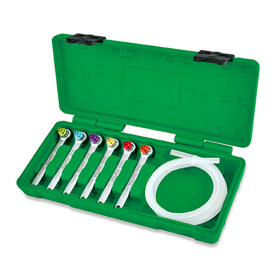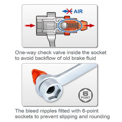 de utilizat fără a scoate roțile sau a ridica vehiculul . priză captivă, care se potrivește direct pe șurubul de aerisire, ceea ce face slăbirea și strângerea mai ușoară și mai convenabilă Cod de culoare pentru o identificare ușoară a dimensiunii Potrivit pentru toate vehiculele, SUV-urile, camioanele ușoare sau motociclete etriere de frână și cilindri de roată Setul include șase chei de aerisire de frână și o purjare de silicon de 1M furtun