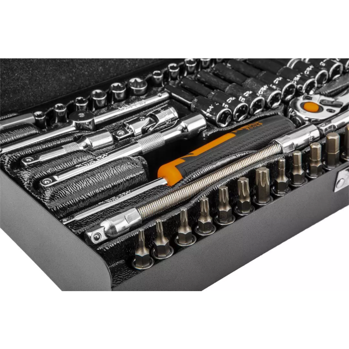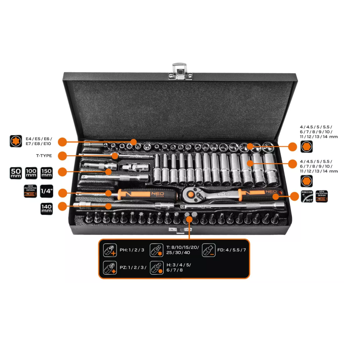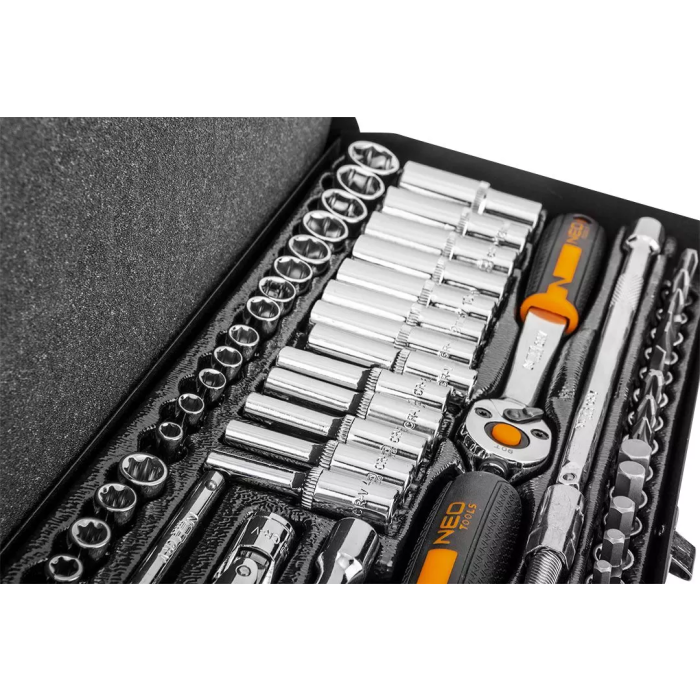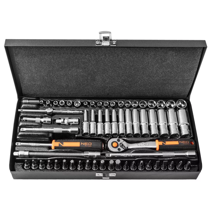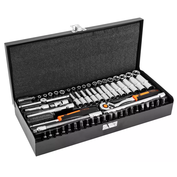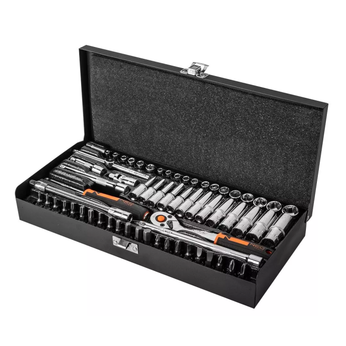 „Setul complet de chei de înaltă calitate, care conține 63 de piese de instrumente și accesorii de la marca NEO. Produsele sunt oferite într-o valiză metalică durabilă, cu o închidere practică și un logo elegant gravat. În plus, interiorul ambalajului este căptușit cu o burete special, care permite menținerea ordinii și protejează conținutul împotriva deteriorării.