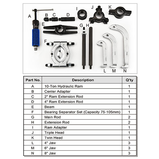 Trusa cuprinzătoare de scule include berbec hidraulic de 10 tone, extractoare de angrenaje și separator de rulmenți pentru a îndepărta angrenajele, rulmenții, scripetele și etc.