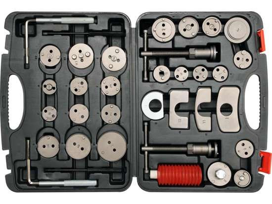 Set profesional de separatoare pentru etriere de frână. Setul contine din două presa (dreapta/stanga) și un set de plăci adaptate la majoritatea mașinilor. Kit-ul conține 35 de elemente.