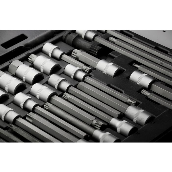 „Set tubulare cu profil Torx 1/4″” – 1/2″” Neo 08-710. Set de 38 bucati. Geanta din plastic pentru depozitare si transport.