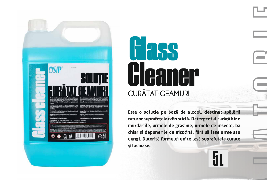 Este o solutie pe baza de alcool, destinat spalarii tuturor suprafetelor din sticla. Detergentul curata bine murdariile, urmele de grasime, urmele de insecte, ba chiar si depunerile de nicotina, fara sa lase urme sau dungi. Datorita formulei unice, lasa suprafetele curate si lucioase
