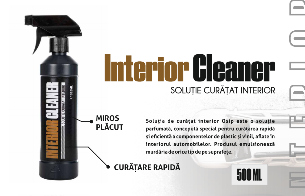Solutia de curatat interior Osip este o solutie parfumata, conceputa special pentru curatarea rapida si eficienta a componentelor de plastic si vinil, aflate in interiorul automobilelor. Produsul emulsioneaza murdaria de orice tip de pe suprafete.