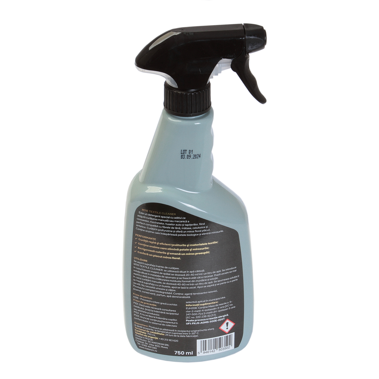 MTR TEXTILE CLEANER este un detergent special cu aditivi ce asigură curățarea manuală sau mecanică a covoarelor, mochetelor, huselor auto și tapițeriilor, fiind perfect compatibil cu fibrele de lână, mătase, celulozice și sintetice. Curăță în profunzime și oferă un miros floral plăcut. Conține enzime care îndepărtează petele biologice și elimină mirosurile.