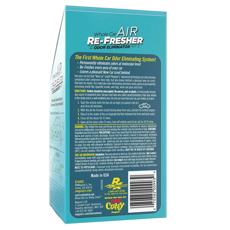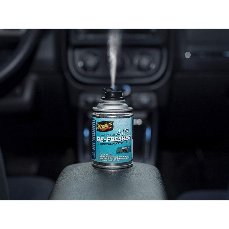 Daca masina ta nu miroase a proaspat si curat, Meguiars are o solutie permanenta pentru tine, rapida si usor de folosit! Meguiar’s Whole Car Air Re-Fresher Odor Eliminator Mist New Car Scent penetreaza interiorul masinii tale, eliminand mirosurile neplacute permanent! Folosit o singura data Odorizantul Meguiars curge prin sistemul de ventilatie si ajunge in toate locurile din masina, eliminand mirosurile neplacute si lasand in urma un miros proaspat si curat!