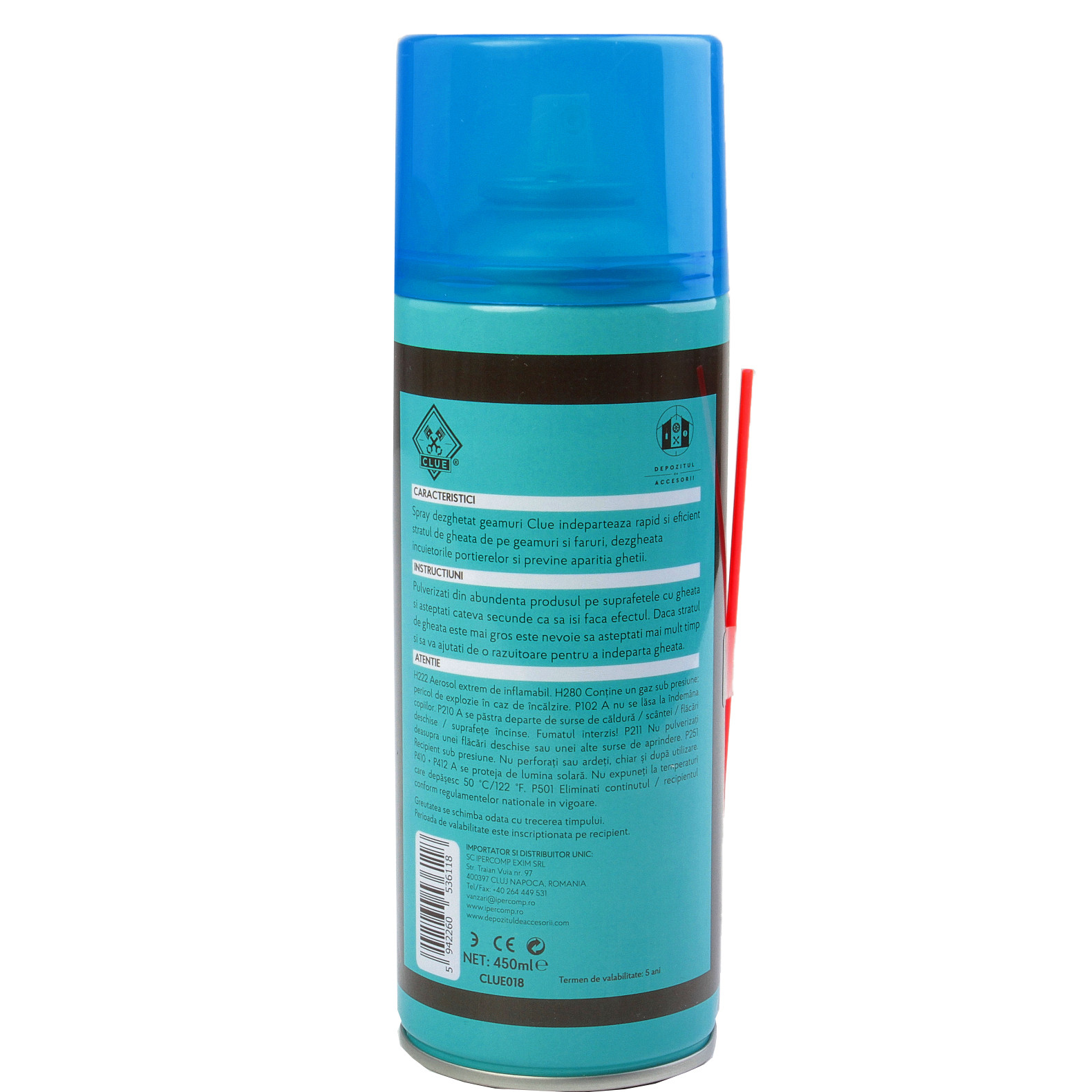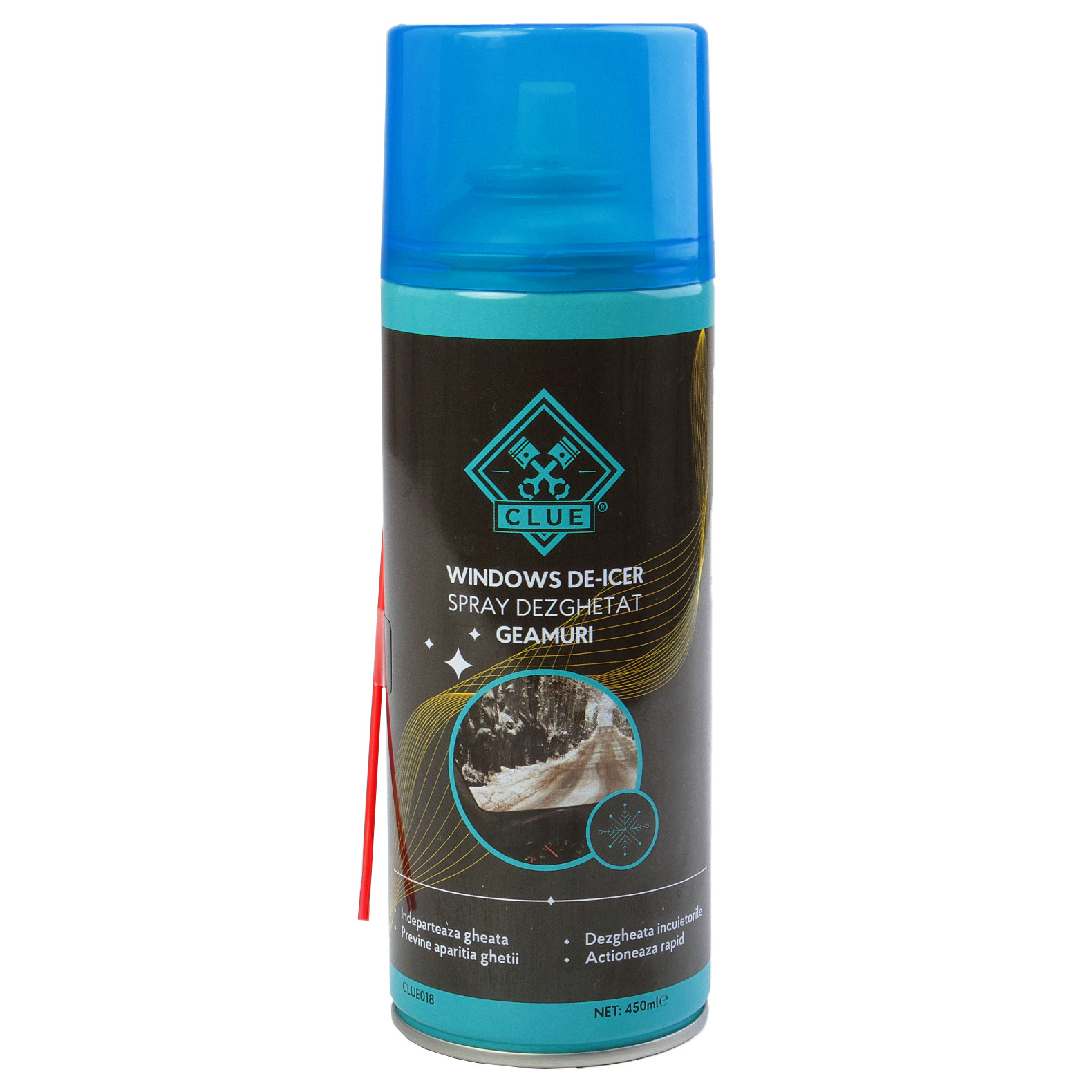 Spray-ul pentru dezghețat geamuri Clue îndepărtează rapid și eficient stratul de gheață de pe geamuri și faruri, dezgheață încuietorile portierelor și previne apariția gheții.