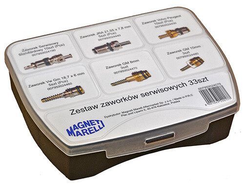 Kit valve service Magneti Marelli 007950024070 este un set profesional destinat întreținerii sistemelor de aer condiționat auto. Conține 33 de valve standard și speciale, acoperind o gamă largă de aplicații (GM, Ford, Volvo, Peugeot, pneumatice etc.). Produsul este conceput pentru service-urile de climatizare auto, facilitând etanșarea rapidă și fiabilă a porturilor de service