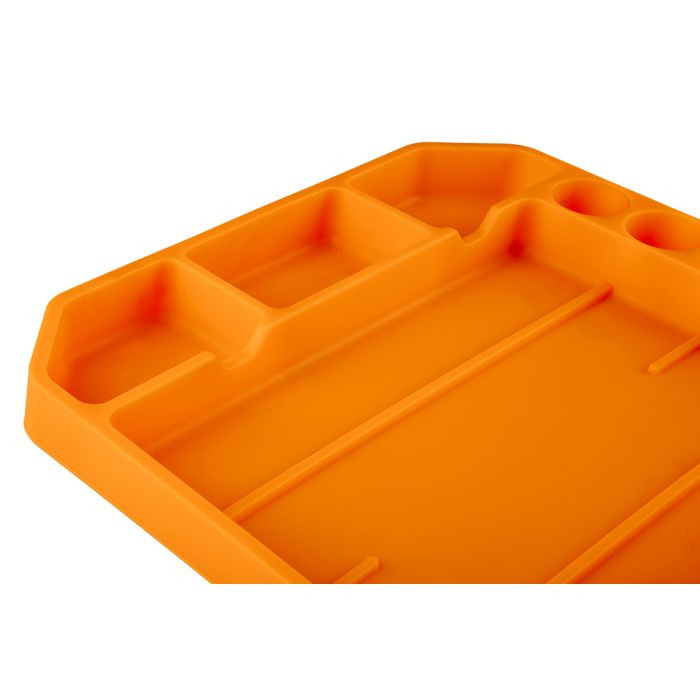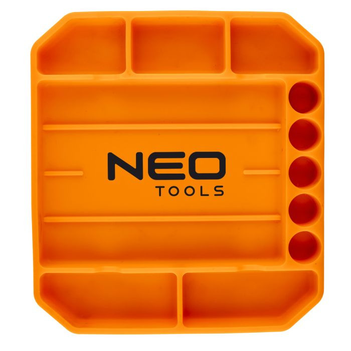 Tavă pentru scule, silicon 25.7 x 23.2 x 2.5 cm 10-481 de la NEO, din silicon flexibil și antiderapant. Acesta are dimensiuni de 25.7 x 23.2 x 2.5 cm și o adâncime de 20 mm pentru a preveni căderea instrumentelor. Are 6 buzunare practice și 5 suporturi pentru șepci. Materialul protejează accesoriile depozitate în el împotriva deteriorării. Recomandat pentru menținerea ordinii în atelier și depozit.