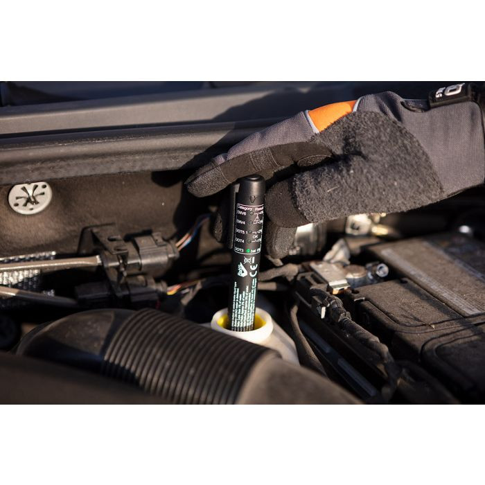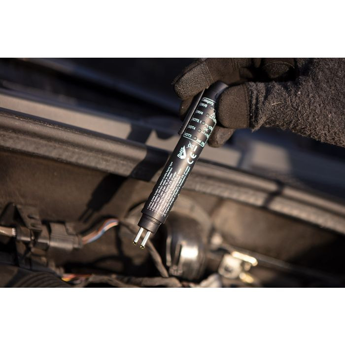 Testerul de lichid de frana 11-269 LED de la NEO TOOLS este un dispozitiv pentru analizarea continutului de apa din lichidul de frana cu 5 indicatori LED. Acesta este utilizat pentru a testa lichidele de frana: DOT3, DOT4, DOT5.1, ENV6 si ENV4, ceea ce contribuie la versatilitatea sa. Acesta face posibila testarea cantitatii de apa din lichid, minimizand riscul de defectare a sistemului de franare. Testerul de lichid de frana NEO TOOLS este usor de utilizat si de depozitat. Functioneaza pe baza unei baterii AAA usor accesibile si universale (baterie inclusa). Acesta va fi indispensabil in echipamentul fiecarui mecanic si pasionat de automobile.