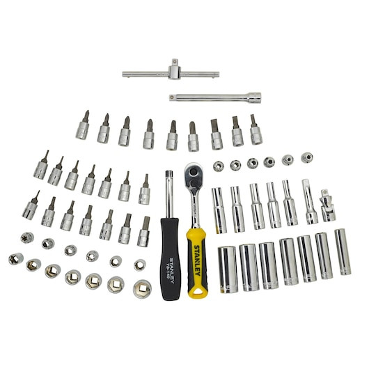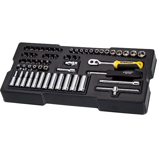 Setul de 60 bucăți de chei tubulare de 1/4 in. STANLEY® TRANSMODULE SYSTEM™ într-o carcasă de modul este compatibil cu dulapurile de depozitare din sistemul Transmodule STANLEY®. Setul vine cu un clichet cu cap de pară din oțel-crom-vanadiu, cu mâner din două materiale și chei tubulare din crom-vanadiu.