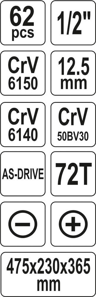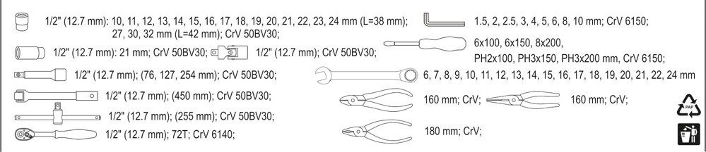 Cutie de scule profesionala realizata din tabla de otel dubla. Cheile sunt realizate din otel CrV 50BV30. Celelalate accesorii sunt fabricate din otel CrV CrV 6140 și 6150. Cheile sunt echipate cu sistem AS-Drive
