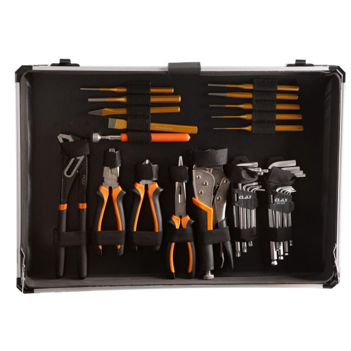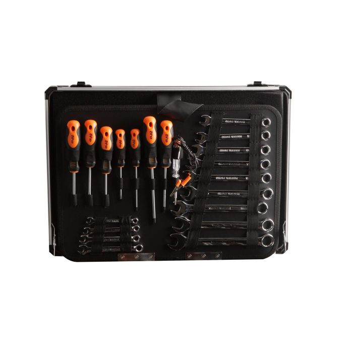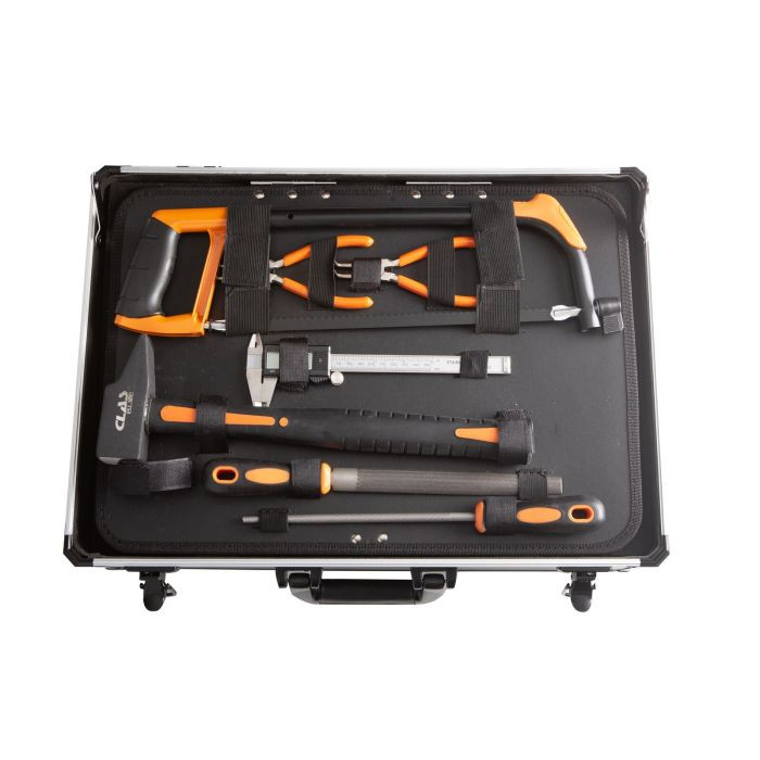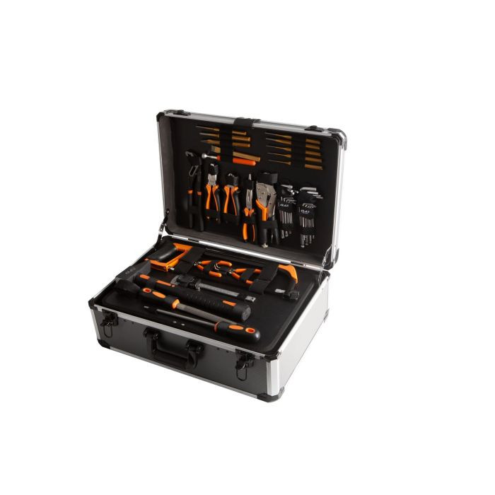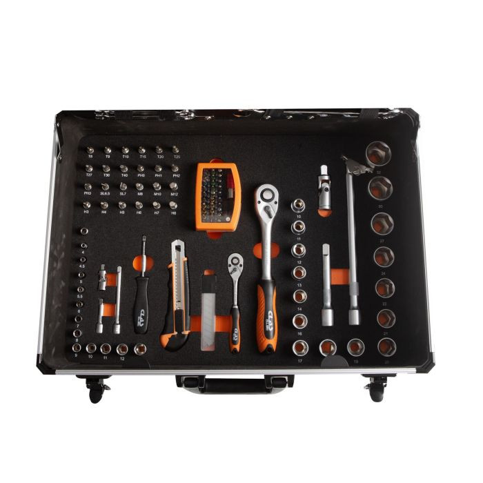 Conținut: – 1 geantă – 1 clește de telefon 150 mm – 1 clește cu vârf lung 200 mm – 1 clește combinat 180 mm – 1 clește cu blocare 250 mm – 1 cheie reglabilă 250 mm – 6 chei 150 mm: 2-3-4-5-6 mm – 3 dălți 150 mm – 9 chei hexagonale: 1.5-2-2.5-3-4-5-6-8-10 – 9 chei Torx: T10-15-20-25-27-30-40-45-50 – 1 magnet telescopic – 1 ferăstrău 450 mm – 1 șubler 0-150 mm – 2 pile 200 mm – 1 ciocan 1 kg – 2 clești cu inel de siguranță – 13 chei fixe: 7-8-9-10-11-12-13-14-15-16-17-18-19mm – 7 șurubelnițe – 1 tensiometru – 1 clichet 1/2″ – 2 prelungitoare 1/2″: 125-250mm – articulație universală 1/2″ – 16 chei tubulare 1/2″: 10-11-12-13-14-16-17-18-19-20-21-22-24-27-30-32mm – 1 clichet 1/4″ – 2 extensii 1/4″: 50-100mm – 12 chei tubulare 1/4″: 4-4,5-5-5,5-6-7-8-9-10-11-12-13mm – 1 port-tubulară 1/4″ – articulație universală 1/4″ – 1 1/4″ Suport biți – 1 cutie biți (32 buc) – 24 biți tubulare: T40-30-27-25-20-15-10-9-8, PH3-2-1-0, SL7-6.5, M12-10-8, H8-7-6-5-4-3 – 1 freză 18 mm – 10 lame de rezervă 18 mm