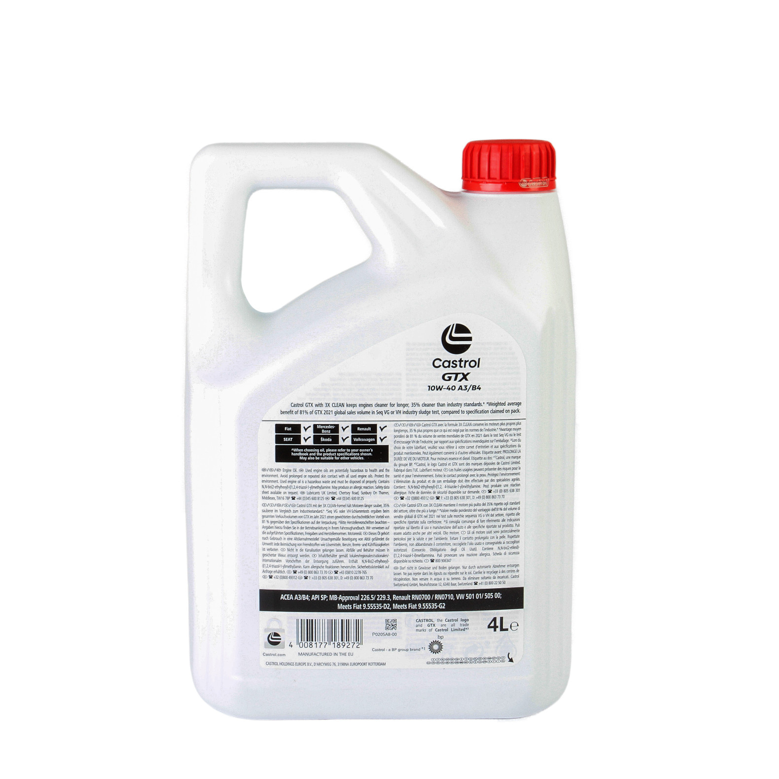 Castrol GTX este unul dintre cele mai de incredere uleiuri de motor din lume. Lumea modernă creează provocări dificile pentru motoare. Calitatea slabă a combustibilului, căldura și condițiile severe de conducere pot determina acumularea unor depuneri, numite nămol. Aceasta poate scurta durata de viață a motorului. Nămolul este un depozit lipicios care se acumulează în canalele vitale prin care circula uleiul, putand astfel împiedica uleiul să protejeze motorul. Tehnologia sintetică Castrol GTX Ultraclean are performanțe superioare. Formula sa cu acțiune dublă curăță depunerile vechi de nămol și protejează împotriva formării de noi depozite de nămol, oferindu-vă mai mult control asupra condițiilor dificile de astăzi. Ajutați la prelungirea duratei de viată a motorului dumneavastră cu Castrol GTX Ultraclean. Domeniul de aplicare Castrol GTX Ultraclean10W-40 AIB este adecvat pentru a fi folosit la motoarele automobilelor care utilizeaza drept carburant benzină și motorină, acolo unde producătorul autoturismului recomandă un lubrifiant IOW-40 cu specificatiile ACEA A3/B4, A3/B3, API SP (sau anterioare). Castrol GTX Ultraclean IOW-40 AIB este omologat pentru utilizarea în vehicule pentru care este necesar sa fie satisfacute specificatiile MB 226.51 229.3, Renault RN 0700 / RN 0710 și VW 501 01/ 505 OO si satisface ceritele impuse de catre normele Fiat 9.55535-D2 or Fiat 9.55535-G2. Avantaje Castro’ GTX Ultraclean. Oferă o protecție superioară cu 50% împotriva depunerilor de nămolul în comparație cu standardele industriei* Protecție avansată împotriva deteriorarii termice și a pierderii vâscozității Protecție superioară împotriva depunerilor care se produc la temperaturi ridicate Uleiuri de bază de calitate premium și aditivi anti-uzură care ajută la prelungirea duratei de viață a motorului dumneavoastră Cu 50% mai curat decât impune standardul industrial, măsurat conform î API SP Seq. VH Sludge