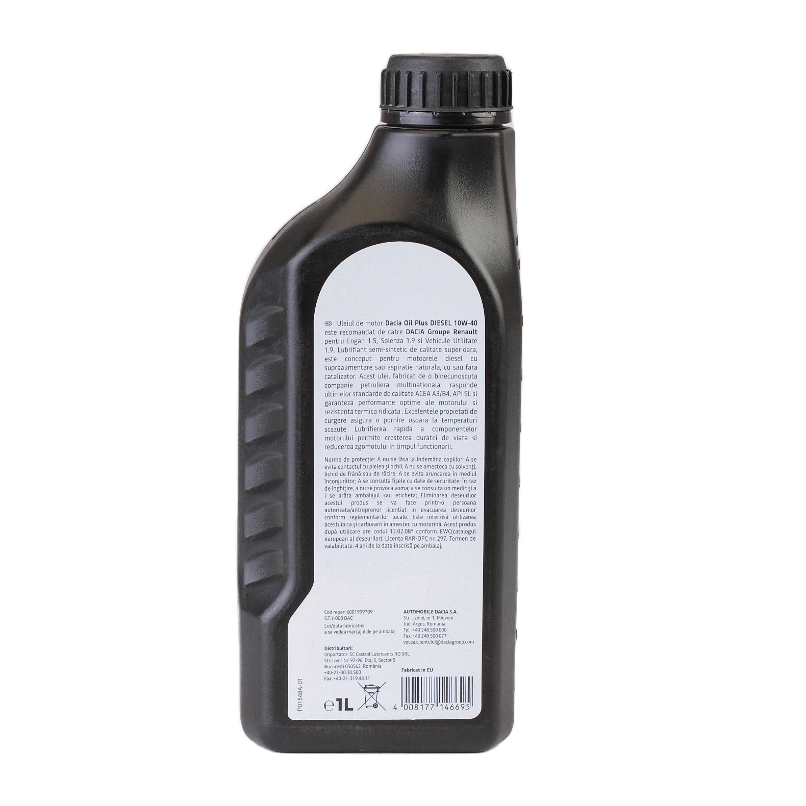 Uleiul de motor Dacia Oil Plus Diesel 10W40 este recomandat de catre Dacia groupe Renault pentru logan 1.5, solenza 1.9 si vehicule utilitare 1.9 Lubrifiant semi-sintetic de calitate superioara, este conceput pentru motoarele diesel cu supraalimentare sau aspiratie naturala, cu sau fara catalizator. Acest ulei, fabricat de o binecunoscuta companie petroliera multinationala, raspunde ultimelor standarde de calitate API CF si garanteaza performante optime ale motorului si rezistenta termica ridicata. Excelentele proprietati de curgere asigura o pornire usoara la temperaturi scazute. Lubrifierea rapida a componentelor motorului permite cresterea duratei de viata si reducerea zgomotului in timpul functionarii.