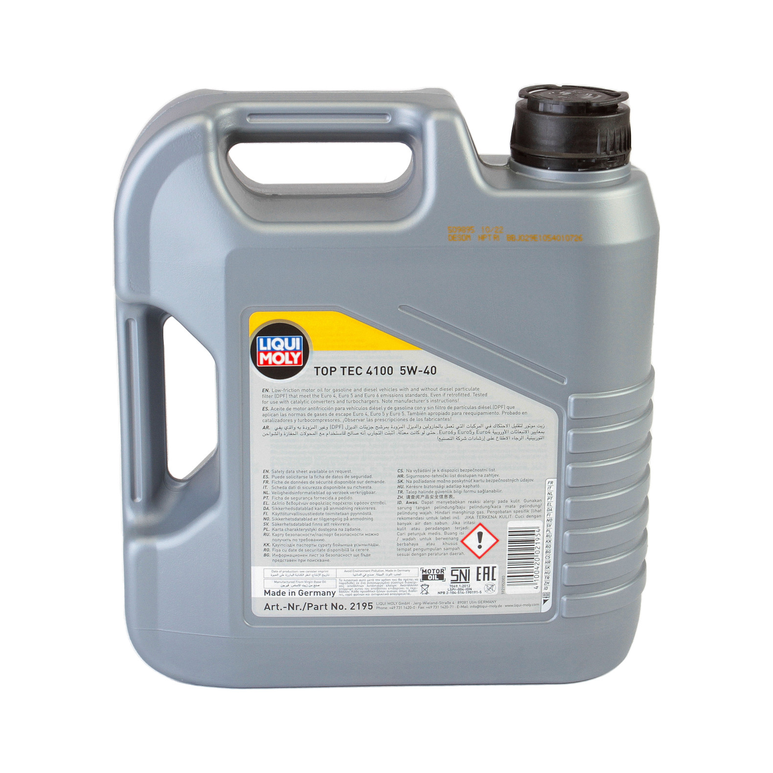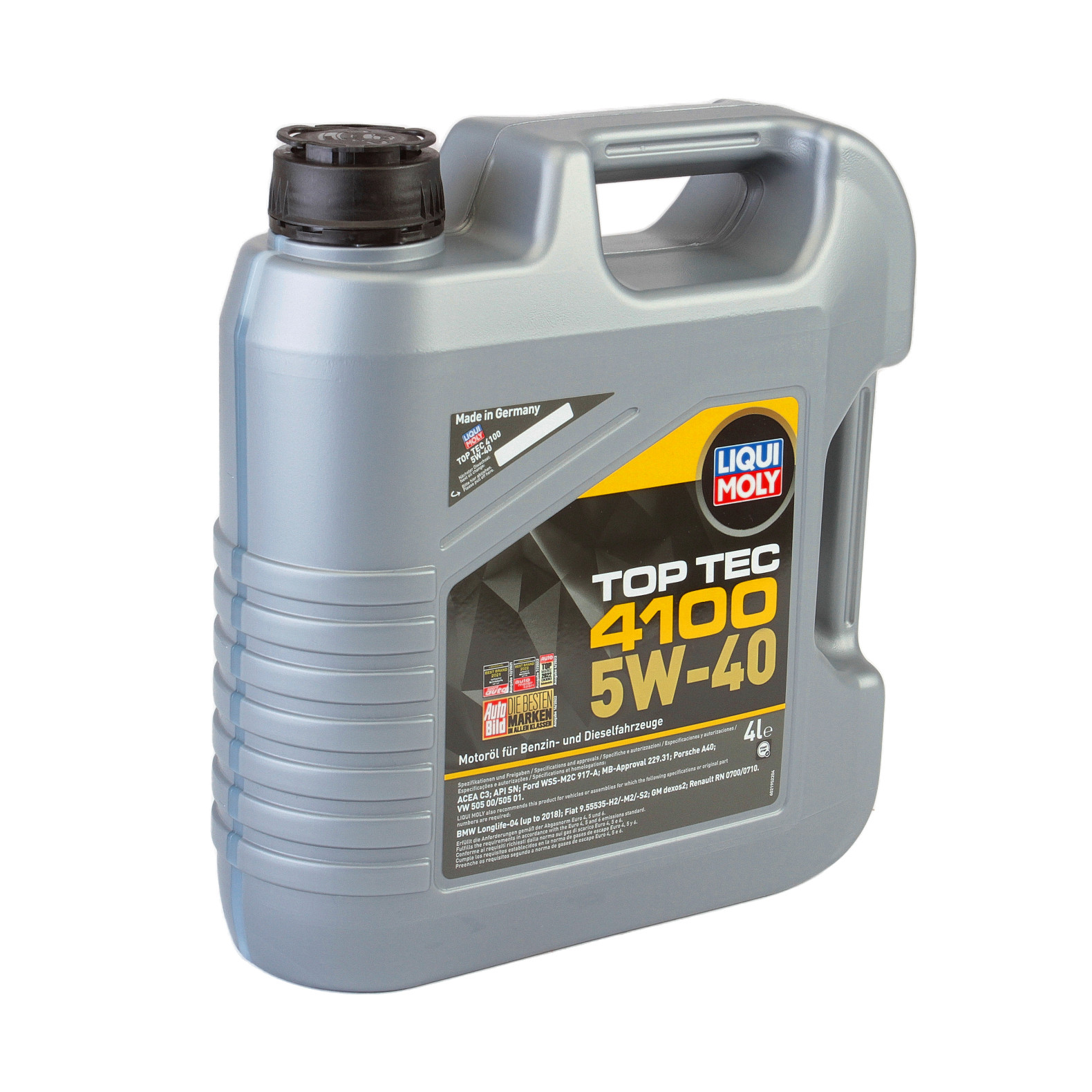 Este un ulei modern de motor, de mare performanţă, recomandat pentru motoarele pe benzina si motorina cu si fara filtru de particule de funingine(DPF). Combinaţia dintre uleiurile de bază neconvenţionale obţinute prin tehnologia de sinteză şi cei mai moderni aditivi garantează un ulei de motor care asigură o protecţie deosebită la uzură, reducând consumul de ulei şi carburant şi asigurând o lubrifiere rapidă a motorului. Astfel, în funcţie de prescripţiile producătorului, se pot obţine intervale de schimb ale uleiului de până la 30.000 km. Uleiul Top Tec 4100 corespunde celor mai noi cerinţe impuse autoturismelor cu EURO 4, 5 si 6. Uleiul se recomanda si in cazul motoarelor pe gaz (CNG/LPG).